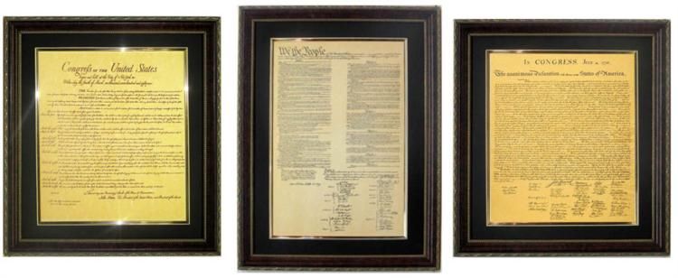 This is a set of three significant United States documents, all brand new, custom framed and matted replicas. These include The Declaration Of Independence, United States Constitution and Bill Of Rights. Each is beautifully framed in a modern contemporary style. Perfect for any office or study.The documents are printed in Antiqued parchment paper that looks and feels authentically old. Custom framed and dry mounted.Framing: 2 Inch Flat Black Chrome Molding, with Gold Filet LiningFrame sizes: 18 x 21 1/2 inches, 18 1/4 x 24 1/4 inches, 18 1/2 x 21 1/2 inches