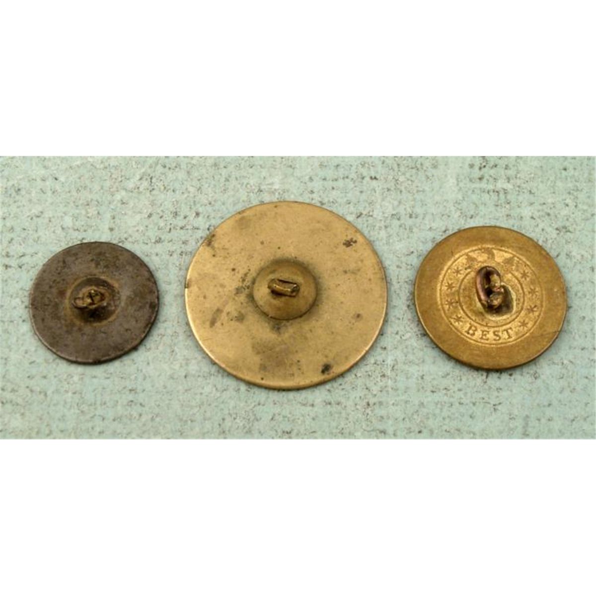 3 U.S. Colonial Era flat buttons, dating from around 1820. One is marked Best with eagle and stars. * Diameter: 3/4" x 1 1/8"Condition: Good, two with broken shanks