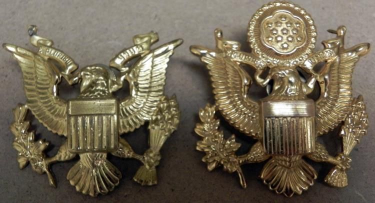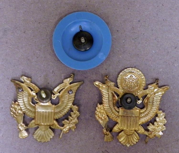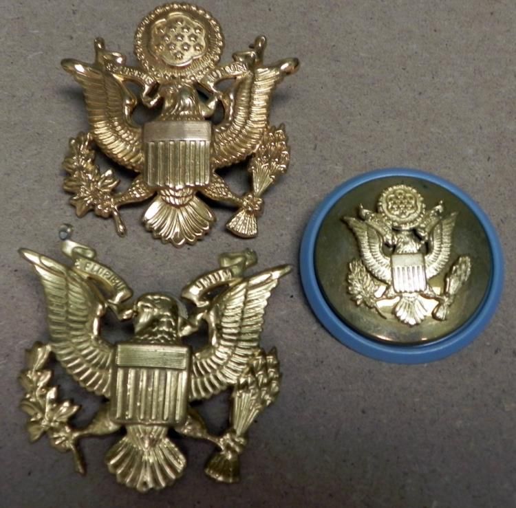 HERE ARE 3 U.S. OFFICER'S & ENLISTED VISOR CAP INSIGNIA-ALL ARE SCREW BACK.
