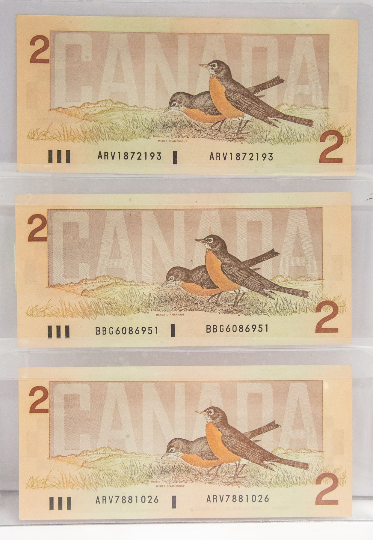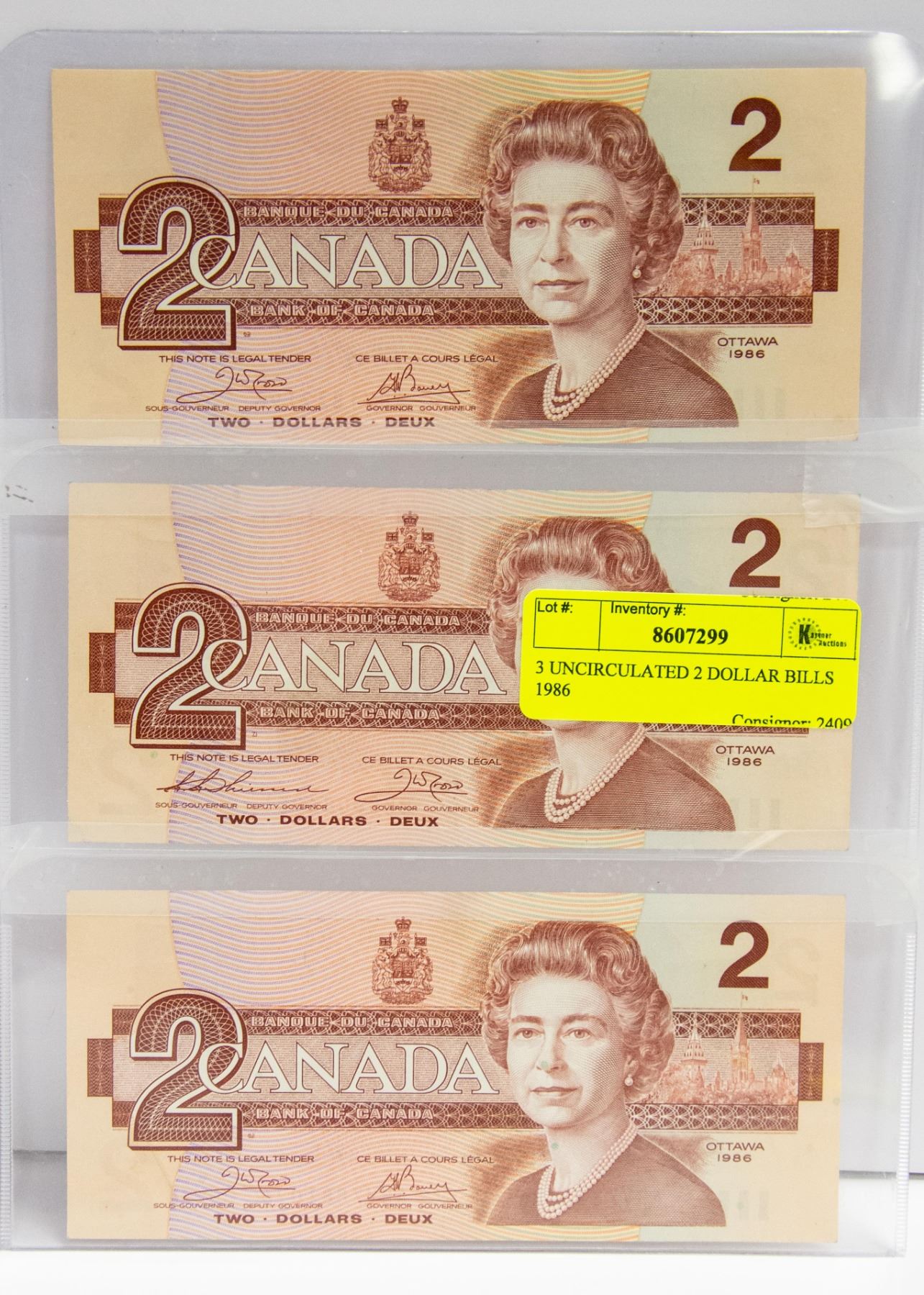 3 UNCIRCULATED 2 DOLLAR BILLS 1986