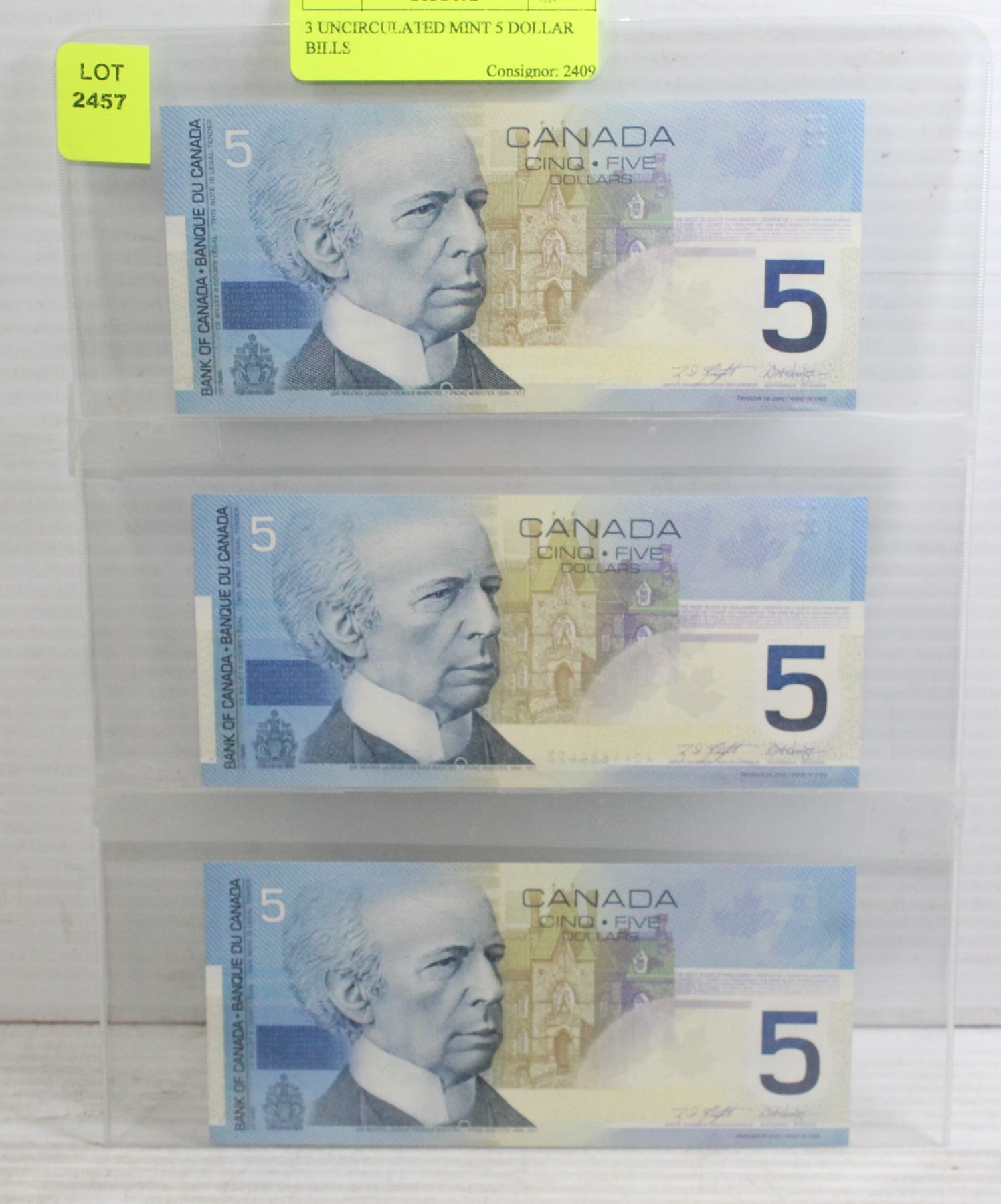 3 UNCIRCULATED MINT 5 DOLLAR BILLS