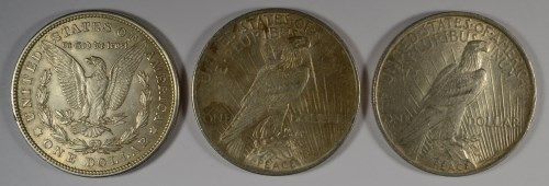 ( 3 ) UNCIRCULATED SILVER DOLLARS: 1921 MORGAN, 1922 AND 1923 PEACE DOLLARS