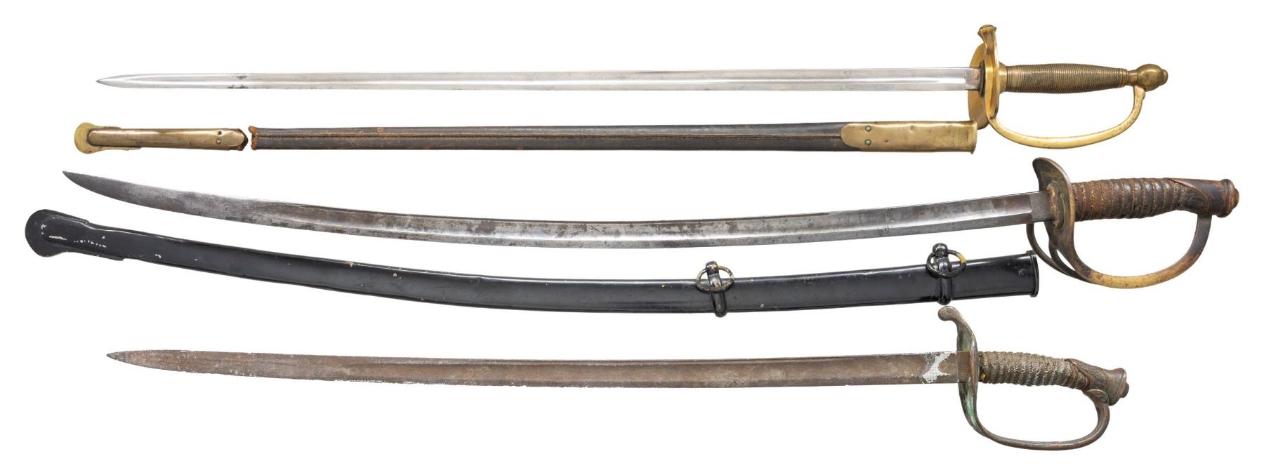 1) NCO. A good example of a M1840 NCO sword measuring 39 1/2" over all with a plain 32 1/4" single fullered blade. The blade is marked "Made by AMES MF'G. CO. CHICOPEE. MASS." AND "US J. F. 1864". Solid brass hilt with brass mounted leather scabbard. CONDITION: blade has substantial original factory polish and a fine mellow patina on the brass. Scabbard leather is relatively good but there is a break just above the drag/tip. 2) CAVALRY. A fair US M1860 cavalry saber measuring 43 1/2" overall with a plain 34 3/4" blade with a single wide fuller and a secondary fuller near the spine. The ricasso is marked "MANSFIELD & LAMB FORESTDALE R. I.'. and "U.S L.W 1864". Brass hilt with a standard 2-branch guard and wire wrapped leather grip. Black painted iron scabbard. CONDITION: blade has a dark gray patina and what looks like chisel marks 5" down from the hilt. The hilt has a dark patina and the leather grip is worn to the wood in spots. Wire complete. The scabbard has been painted black and it appears that dents near the drag has been filled with an epoxy resin and painted over. 3) FOOT OFFICER. A relic foot officer's sword that may be an early excavated example or a field find. The sword measures 36 3/8" with a 30 3/4" blade. Brass hilt with a pierced foliate decorated guard and wire wrapped sharkskin grip. No scabbard. CONDITION. the sword is in relic condition. Blade is corroded and covered in dark rust. Hilt has a dark patina Grip is about 70% and traces of wire remain. (02-24442-3/BF). $500-800.