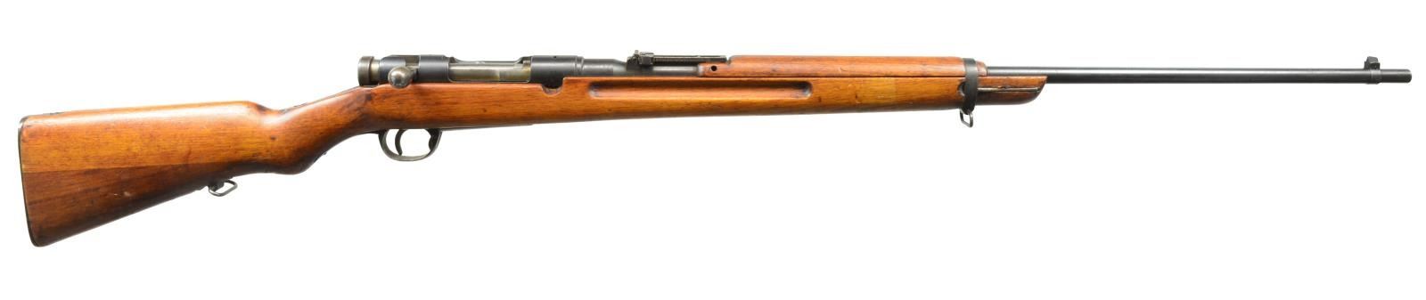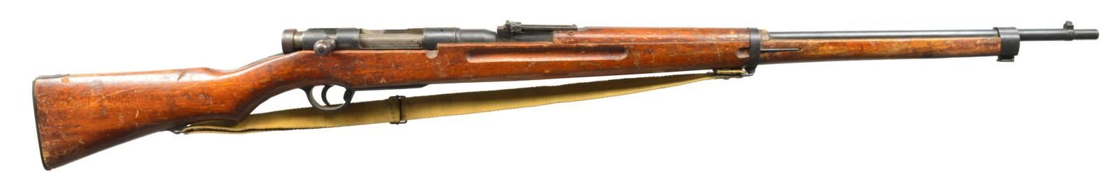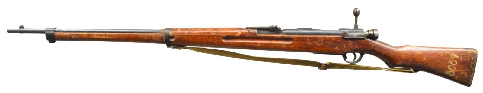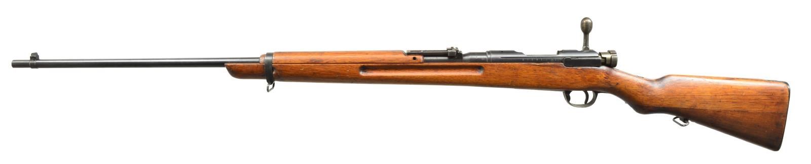 1) SMOOTH BORE TRAINING RIFLE. Cal. 6.5 Blank. S# 766. Bbl. 31 3/4". Numbers match on receiver, bolt & safety knob. Receiver is marked on top w/ 4 Japanese characters. Receiver grooved for dust cover & made w/ solid & integral tang. Bolt w/ straight handle & oval knob. Bolt handle root engages safety notch to act as locking lug, also has rib on bolt which engages forward edge of the receiver bridge. Checkered lg. tang safety knob. Ladder rear sight graduated to 2400m. Inverted V front sight. Cleaning rod is not present. Bayonet lug. Sling swivels are late type w/ thin wire. Hardwood stock set w/ 1 piece buttstock construction. Buttstock has number “8068” on left side in white paint. Khaki web sling w/ leather reinforcement at forward end. CONDITION: stock has extensive wear, flaking & scratches. Metal has 70% blue turning gray w/ patina w/ wear, oxidation & scattered spots of fine pitting. Poor, dark bore. (20-2287/RW). CURIO. 2) TYPE 38 SPORTERIZED RIFLE. Cal. 7.7 Jap. S# 518650. Bbl. 31 3/4". Rifle apparently mfg. in 7.7 Cal. Receiver marked on left rail w/ Kokura Arsenal marking on left rail. Rifle has all type 38 features including “Type 38” marking on receiver ring w/ intact mum. Bbl. is marked on left side, over chamber, w/ “B”. Straight bolt handle w/ oval knob. Numbers match on receiver & bolt. Notched, checkered safety knob. Ladder rear sight graduated to 2400m. Inverted V front sight. Cleaning rod, upper band & forward end of buttstock have been removed during sporterization. Buttstock w/ 2 piece construction retains lower band & bottom sling swivels. CONDITION: stock set has light refinish w/ light wear & scattered handling marks. Metal has 75% original blue w/ thinning & scattered spots of light oxidation. Fair worn bore turning dark. (20-2288/RW). MODERN. 3) 6.5 JAP SMOOTH BORE TRAINING RIFLE. Cal. 6.5 Jap Blank. S# G398. Bbl. 31". Numbers match on receiver, bolt, bayonet lug & trigger guard. Receiver mfg. w/ integral tang. Straight bolt handle w/ oval knob. Bolt handle root serves as locking lug in safety notch. Safety knob has welded construction. Fixed extractor & reduced locking lug on left side of bolt. Receiver marked only w/ S#. Ladder rear sight graduated to 2400m. Inverted V front sight. 25 7/8" Cleaning rod. Hardwood stock set. Buttstock is 2 piece construction. CONDITION: stock set has moderate wear, dents, staining & scratches throughout. Metal has traces of blue turning patina w/ thinning, wear, oxidation & fine pitting throughout. Poor, dark, oxidized bore. (20-2290/RW). CURIO. $700-1,000.