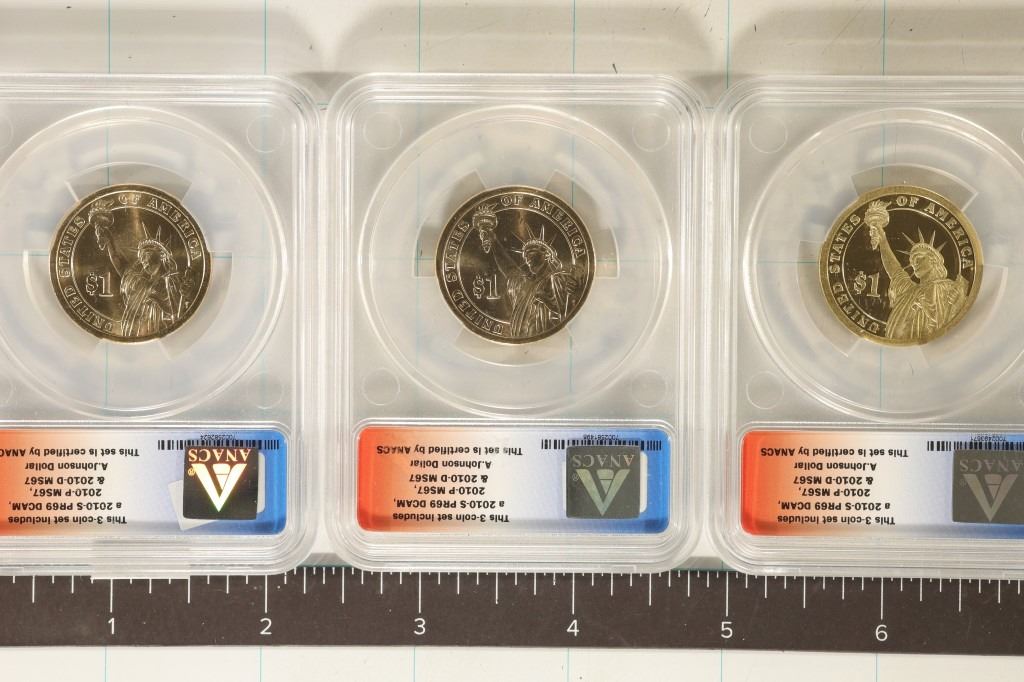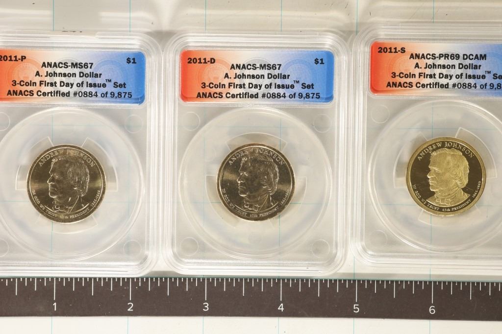 2011-S PR69 DCAM, 2011-P MS67 AND 2011-D MS67. MATCHED SET NUMBER #0884 OF 9875. 3 COIN FIRST DAY OF ISSUE SET.