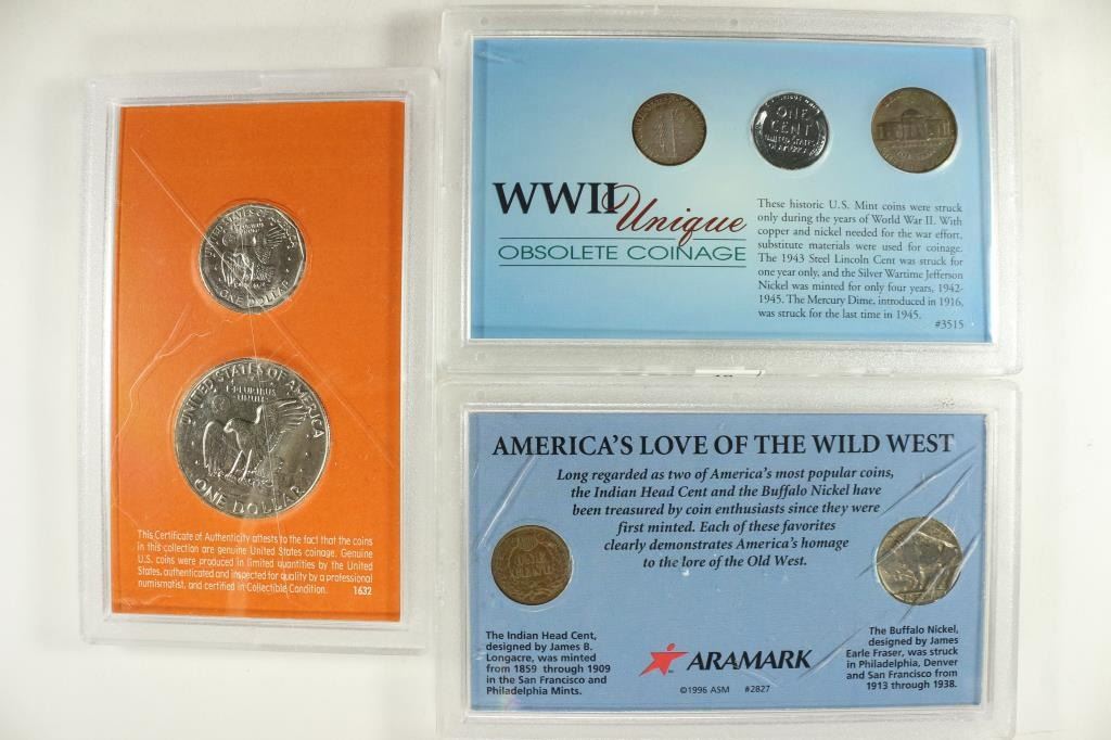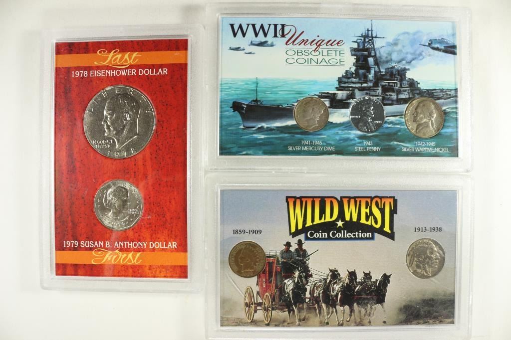 CONTAINS: MERCURY DIME, 35% SILVER JEFFERSON WAR NICKEL AND STEEL PENNY, #2-LAST AND 1ST DOLLARS 1978 EISENHOWER AND 1979 SBA DOLLAR, #3-WILDWEST COIN COLLECTION CONTAINS: INDIAN HEAD CENT AND BUFFALO NICKEL