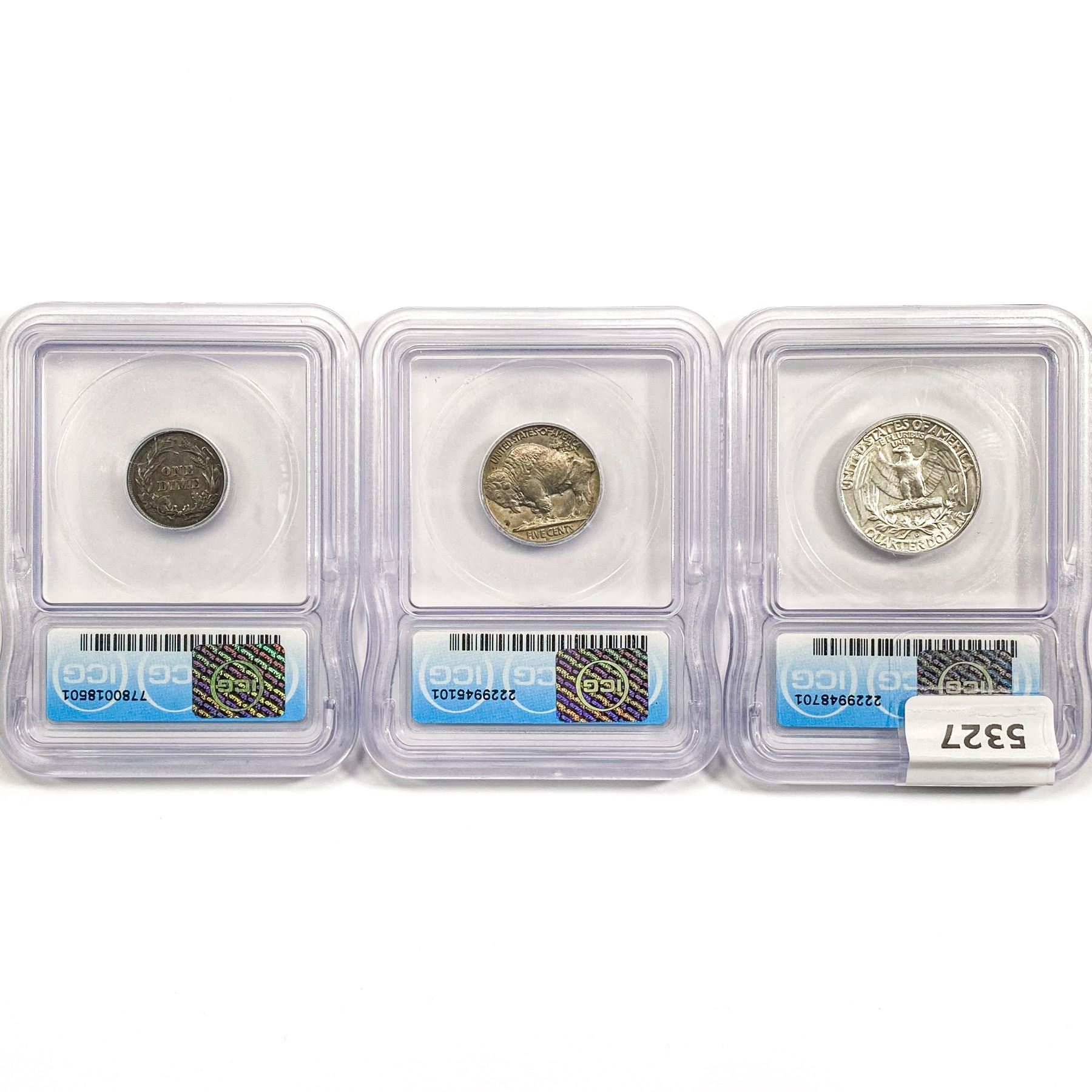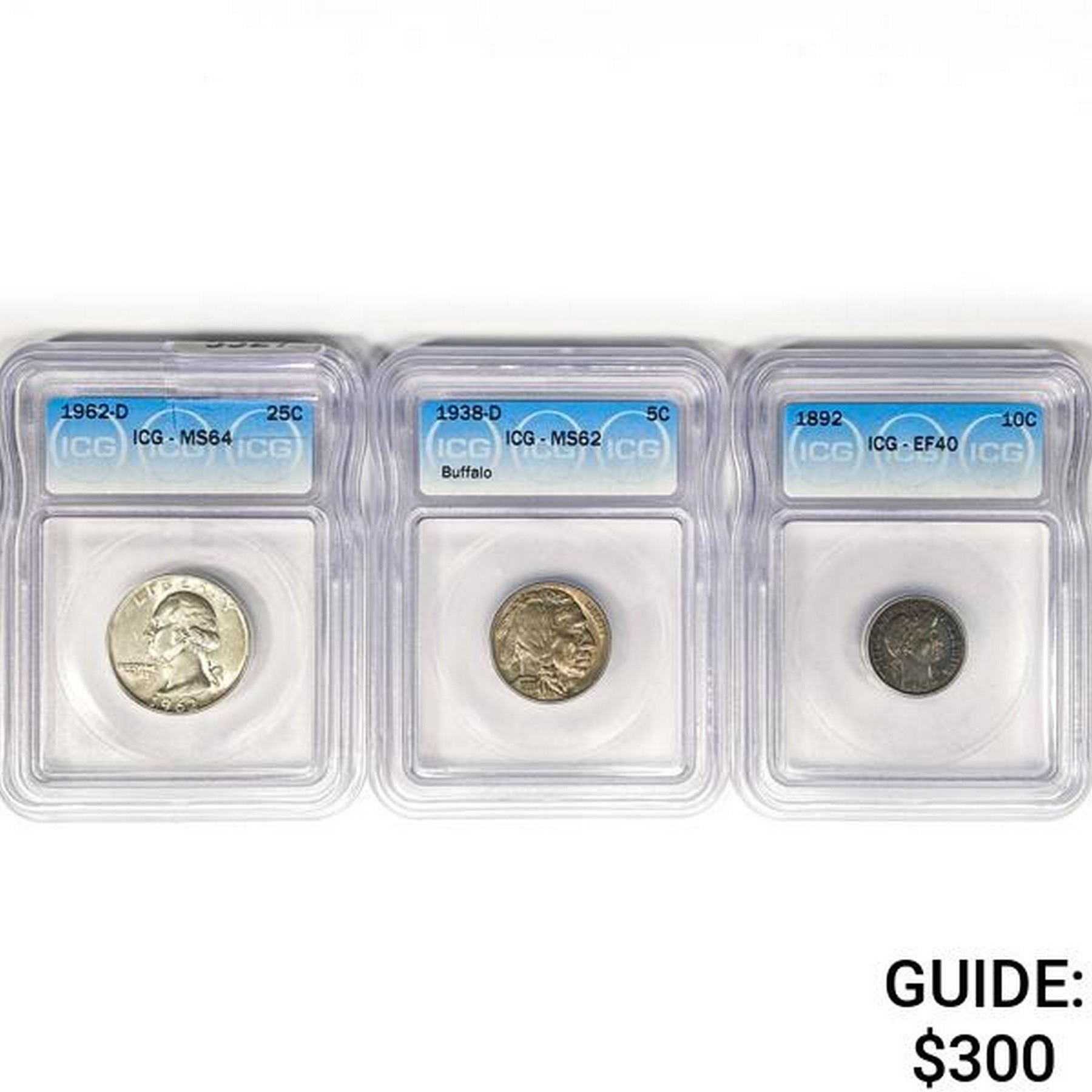 (3) US Varied Coinage ICG EF,MS 1892-1962