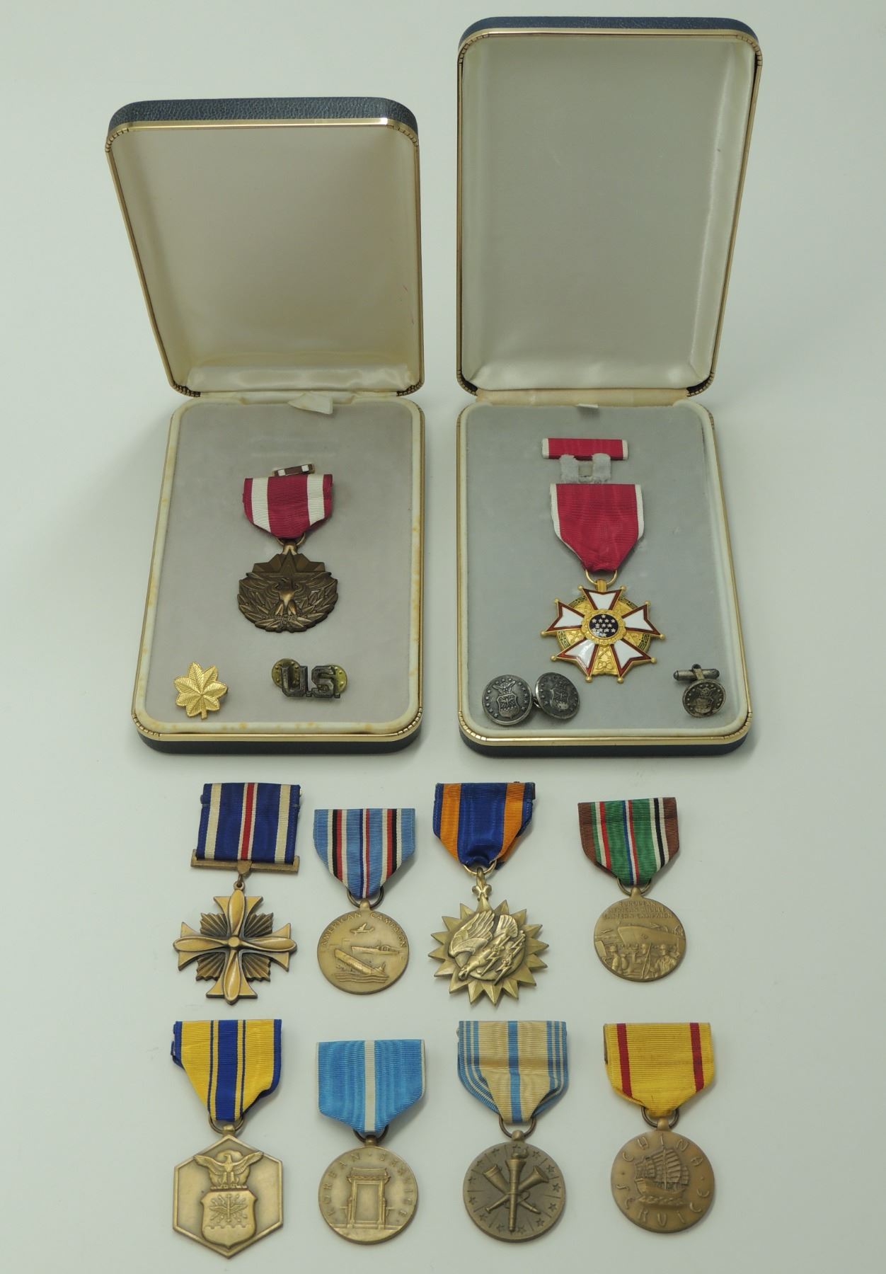 COLONEL LAWRENCE J. YOUNG U.S. AIR FORCE SERVED IN WW2 KOREA & VIETNAM LEGION OF MERIT DISTINGUISHED FLYING CROSS 10 MEDAL GROUPING MERITORIOUS SERVICE MEDAL IS NAMED 2 CASES INCLUDES CHINA SERVICE WW2 ETC BUTTONS PINS ETC NAMED TO