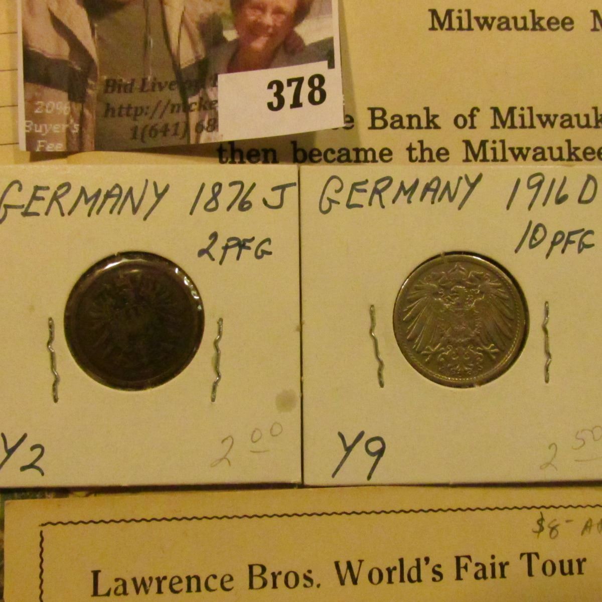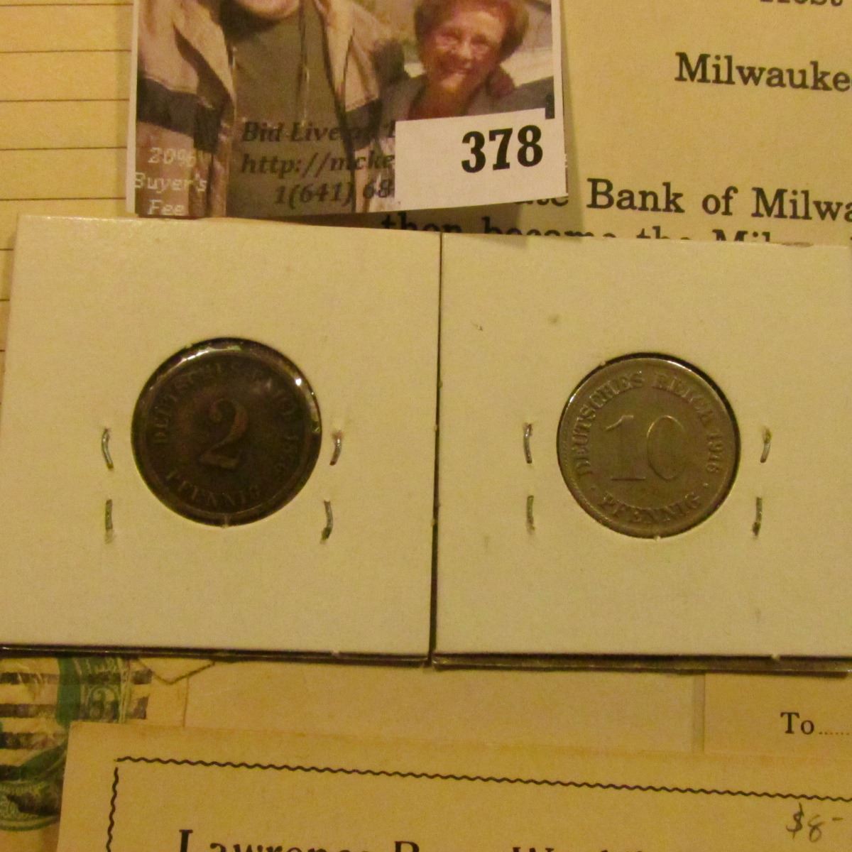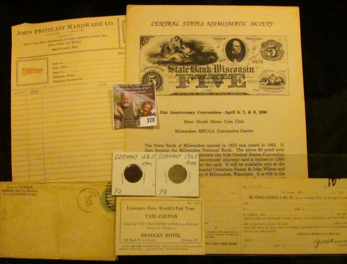 (3) Unused "John Pritzlaff Hardware Co….Everkeen…Milwaukee, Wis." Invoices; unissued "The Eureka Chemical & Mfg. Co., of La Crosse, Wis…"; 1881 Cover "Return to J.H. Sarles, Boscobel, Grant Co., Wisconsin…" with 3c Preprinted stamp; 1990 Central States Numismatic Society 51st Anniversary Convention Souvenir cover; & "Lawrence Bros. World's Fair Tour Taxi Coupon...Bradley Hotel..."; 1876J Germany Two Pfennig; & 1916D Germany 10 Pfennig, Y9.