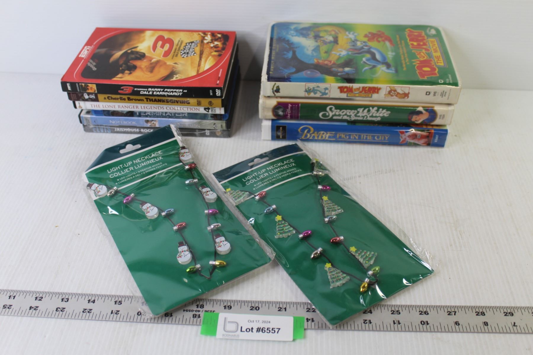 (3) VHS Tapes- Tom & Jerry - Snow White - (6) DVDs - Elvis - Terminator - Charlie Brown - (2) Light-up Necklaces