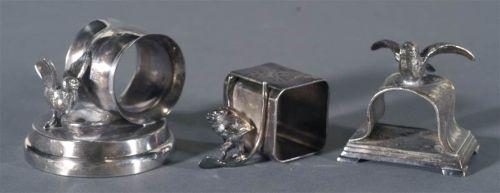 3 VICTORIAN FIGURAL NAPKIN RINGS Bird with wishbone, no maker's mark, 40mm high; open-winged bird, marked #3, 65mm high; open-winged bird over nest, Webster & Bro #173, 65mm high, CONDITION REPORT: Excellent. PACKING AND SHIPPING excl. insurance w/i Contintental U.S. $20 excluding insurance within Continental U.S., multiple lots can be combined at a discount.