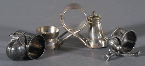 3 VICTORIAN FIGURAL NAPKIN RINGS Double salt, no maker's mark, 78mm high; kiwi bird, English Silver Marks, 50mm high; apple, no maker's mark, 42mm high, CONDITION REPORT: Excellent. PACKING AND SHIPPING excl. insurance w/i Contintental U.S. $20 excluding insurance within Continental U.S., multiple lots can be combined at a discount.