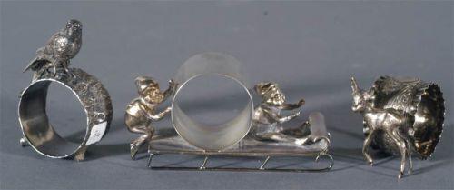 3 VICTORIAN FIGURAL NAPKIN RINGS Fawn, no maker's mark, 50mm high; bird with branch, no maker's mark, 80mm high; 2 elves on a sled, no maker's mark, 55mm high, CONDITION REPORT: Excellent. PACKING AND SHIPPING excl. insurance w/i Contintental U.S. $20 excluding insurance within Continental U.S., multiple lots can be combined at a discount.