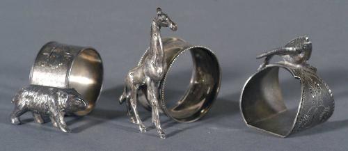3 VICTORIAN FIGURAL NAPKIN RINGS Giraffe, English Silver Marks, 80mm high; bear, no maker's mark, 45mm high; bird, marked #784, 60mm high, CONDITION REPORT: Excellent. PACKING AND SHIPPING excl. insurance w/i Contintental U.S. $20 excluding insurance within Continental U.S., multiple lots can be combined at a discount.