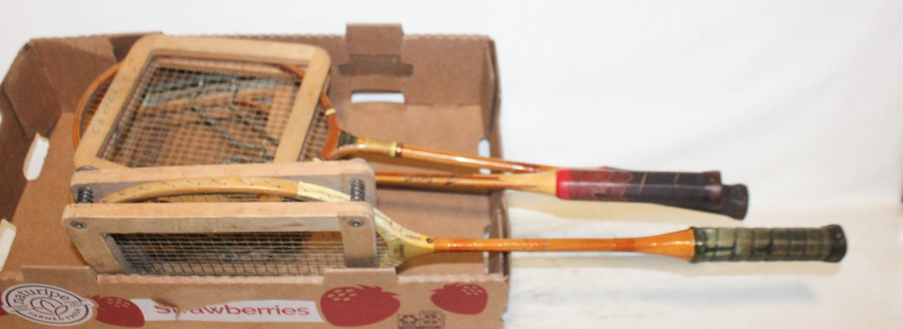 3 VINTAGE BADMINTON RACKETS & HOLDERS