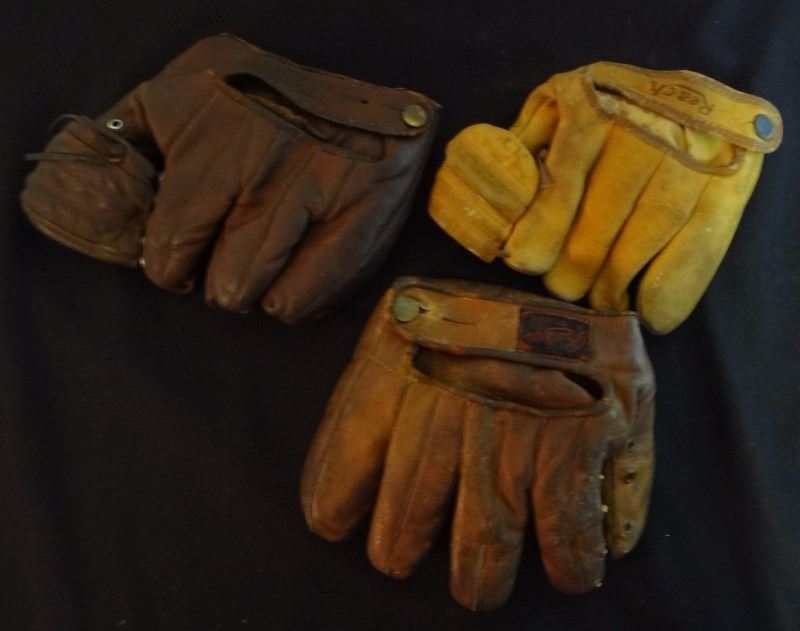 3 - VINTAGE BASEBALL GLOVES; 1920 WILSON 3 FINGER, 1930 REACH CARLTON WILLEY &