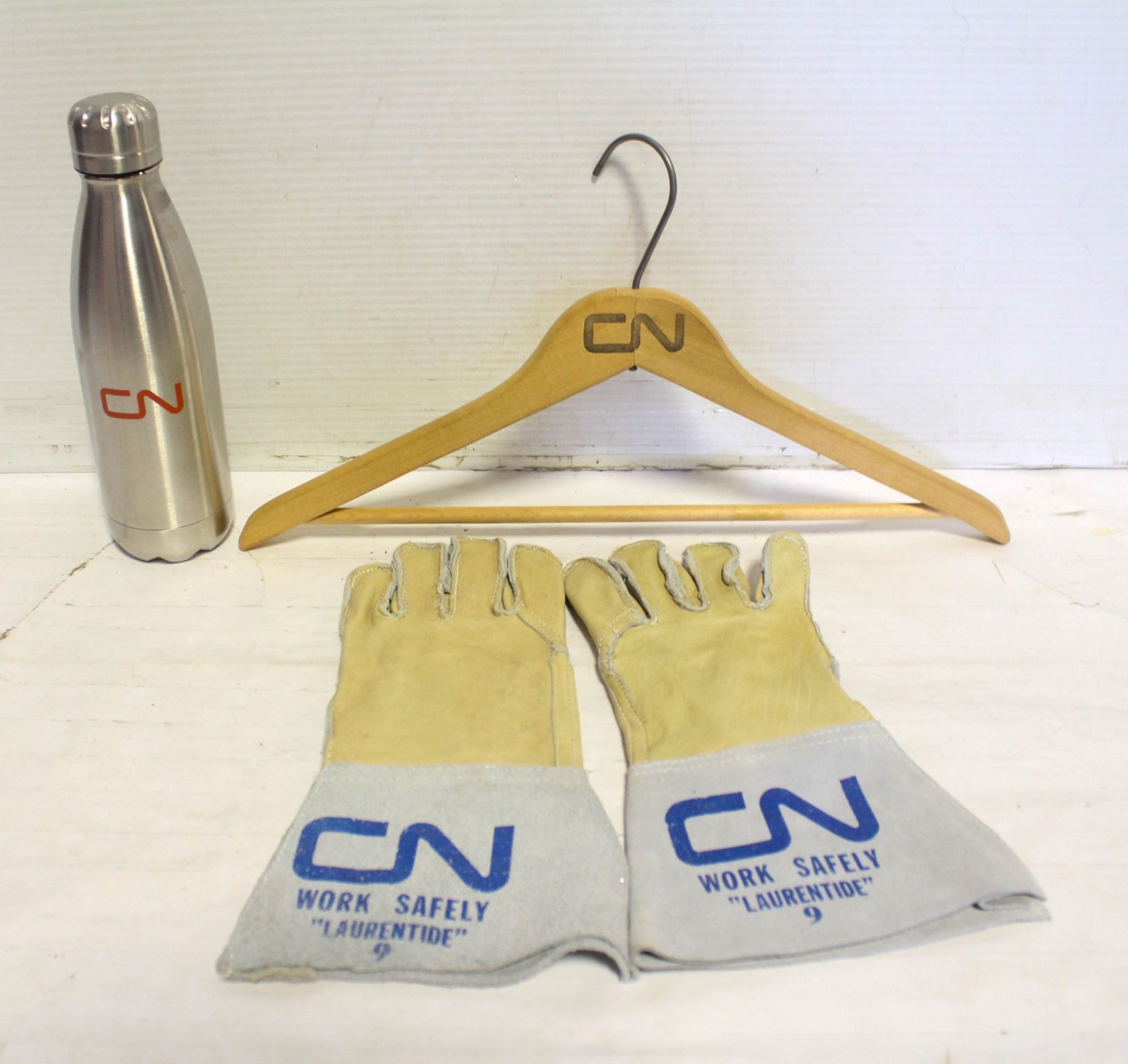 (3) VINTAGE CN CLOTHES HANGER, WORK GLOVES &