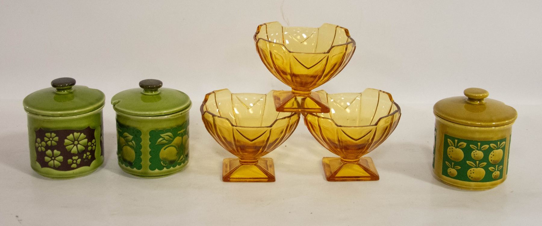 3 VINTAGE COVERED JARS, 3 AMBER GLASS ART