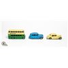3 VINTAGE DINKY TOYS: RILEY, DUNLOP DOUBLE DECKER