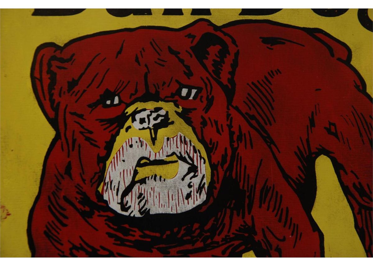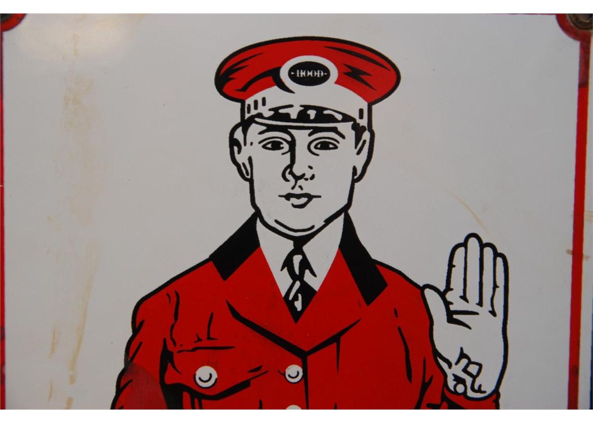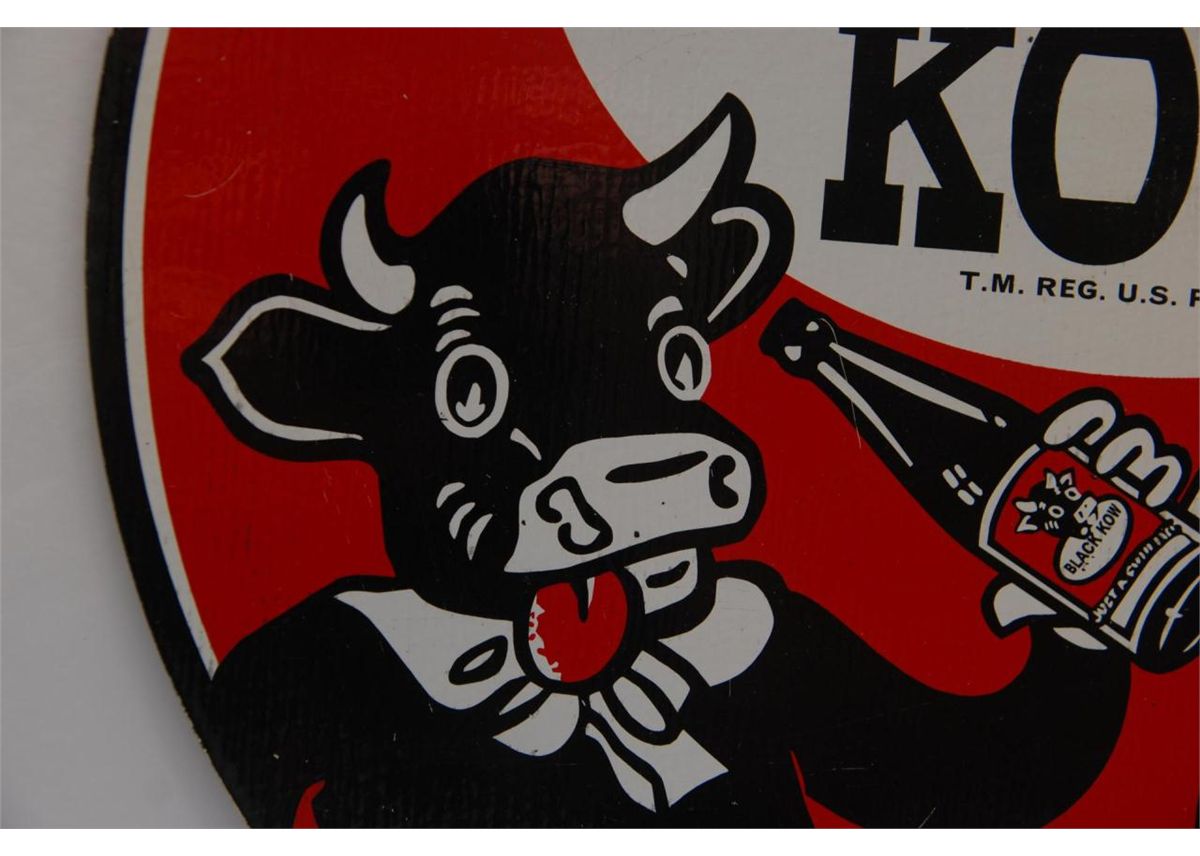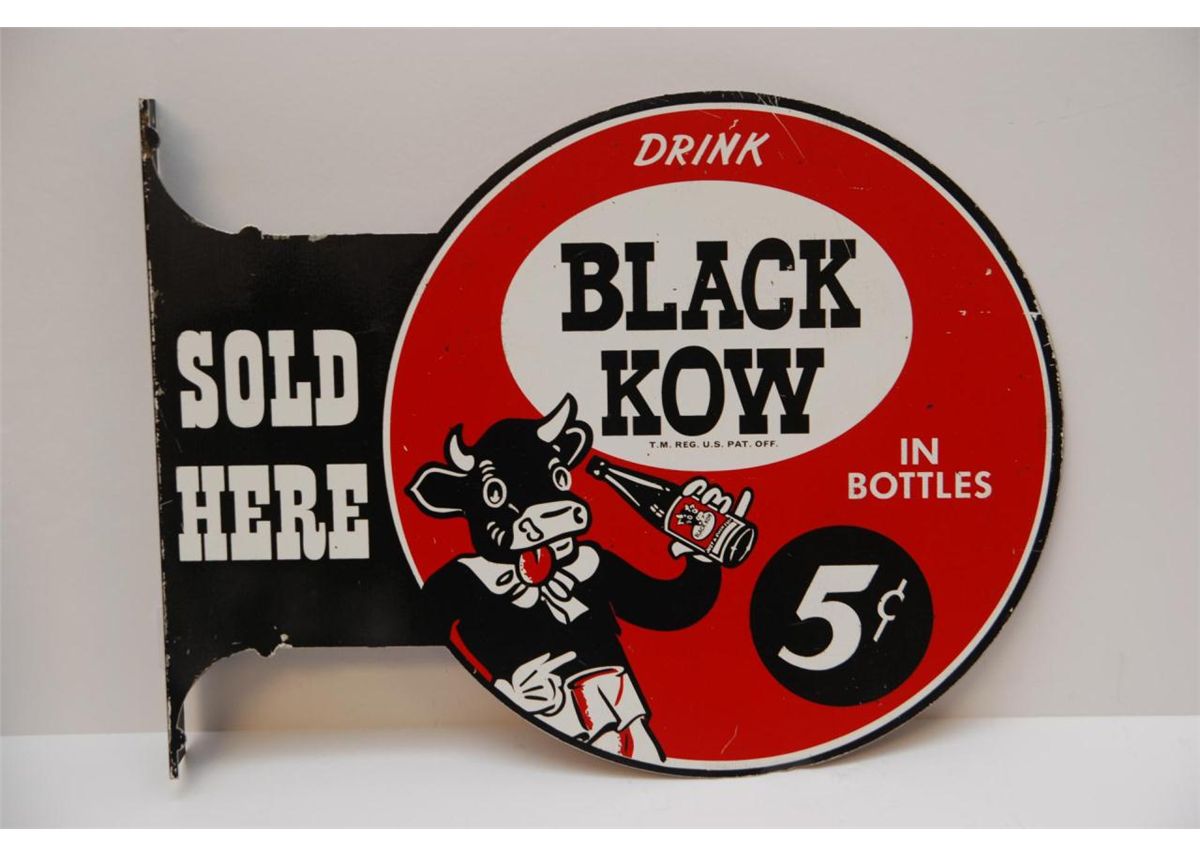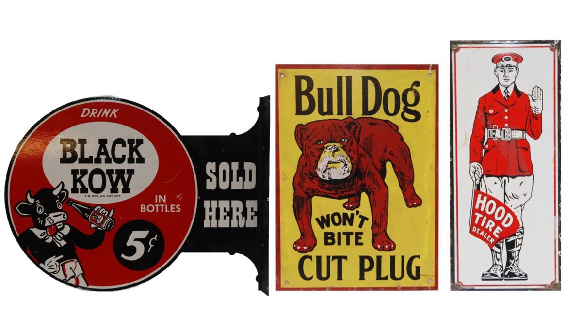 A lot of 3 vintage enameled tin advertising signs. One for 'Hood Tire Dealer' the next of 'Bulldog Cut Plug' tobacco and the last is a 'Black Kow' soft drink sign. Largest measures 18 1/4" length (46.3cm). Total weight of 1.5 kilograms.