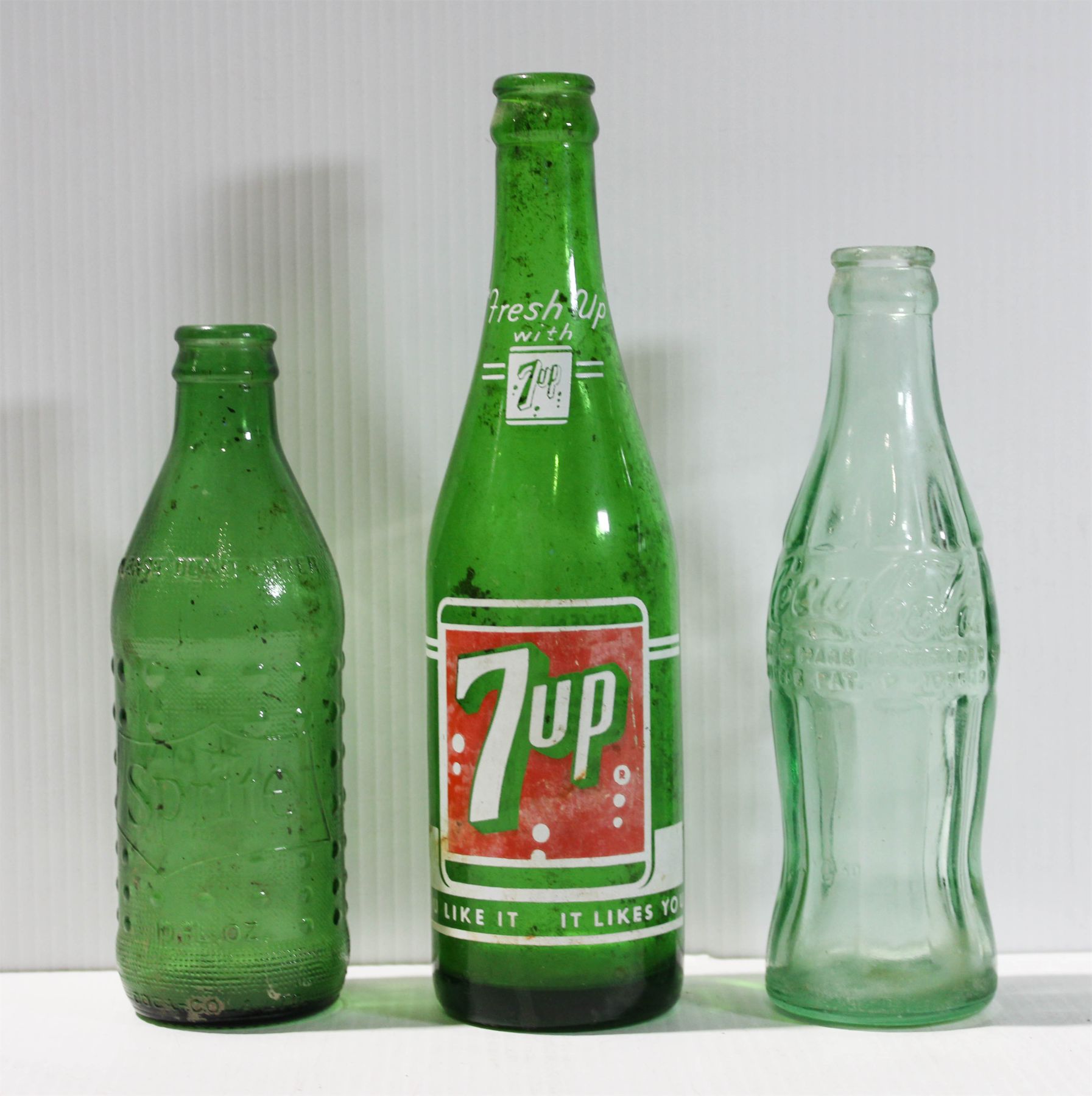 3 VINTAGE GREEN GLASS SODA POP BOTTLES SPRITE, COCA COLA, & 7 UP