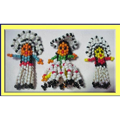 3 miniature Native American dolls, believed to date to the 1950's.Man, woman and child doll.<BR>The little man, the longest of the 3, measures just under 2 inches. THe 2 larger dolls have loops for hanging them from. Good condition with the beads clear and unbroken and tightly arranged.