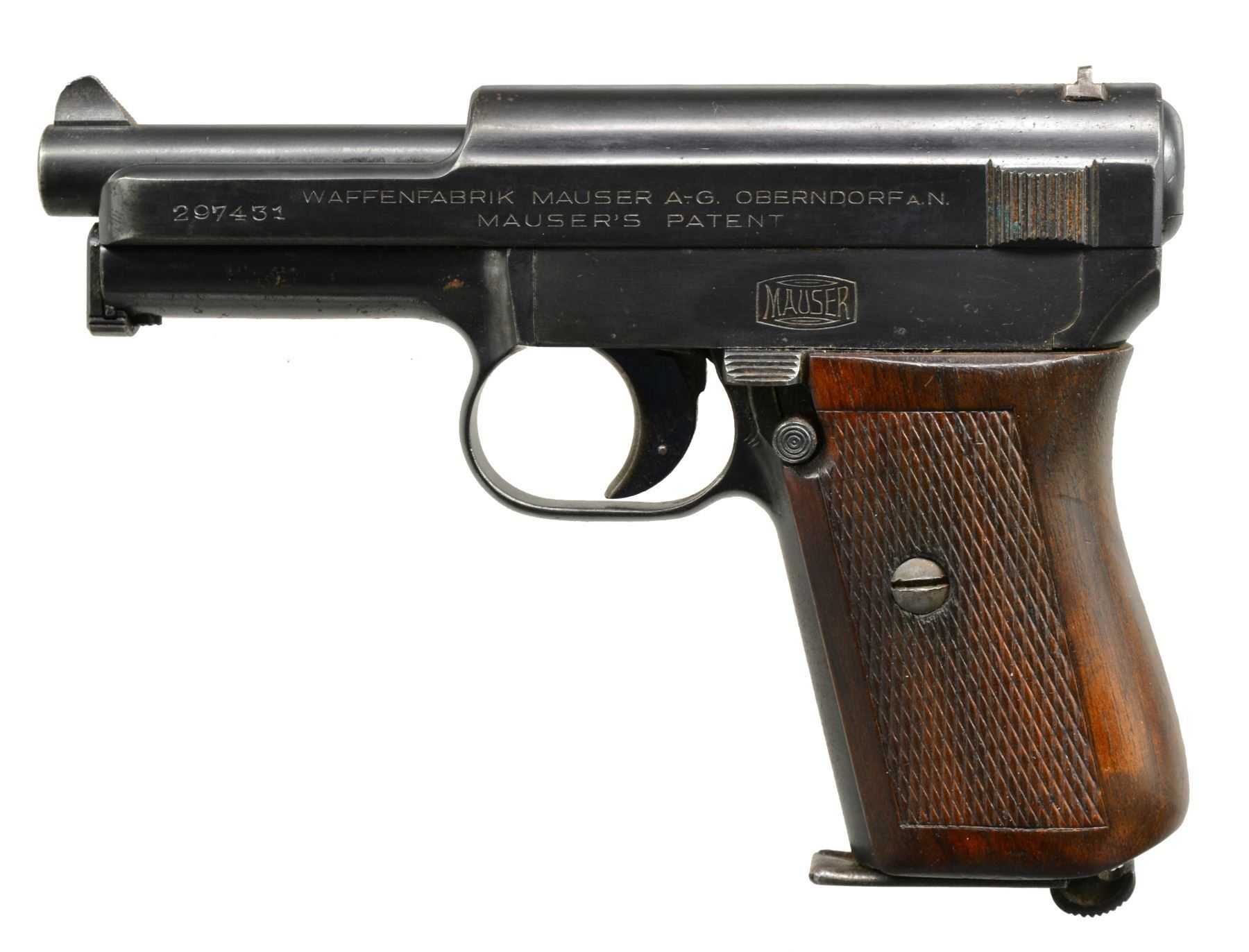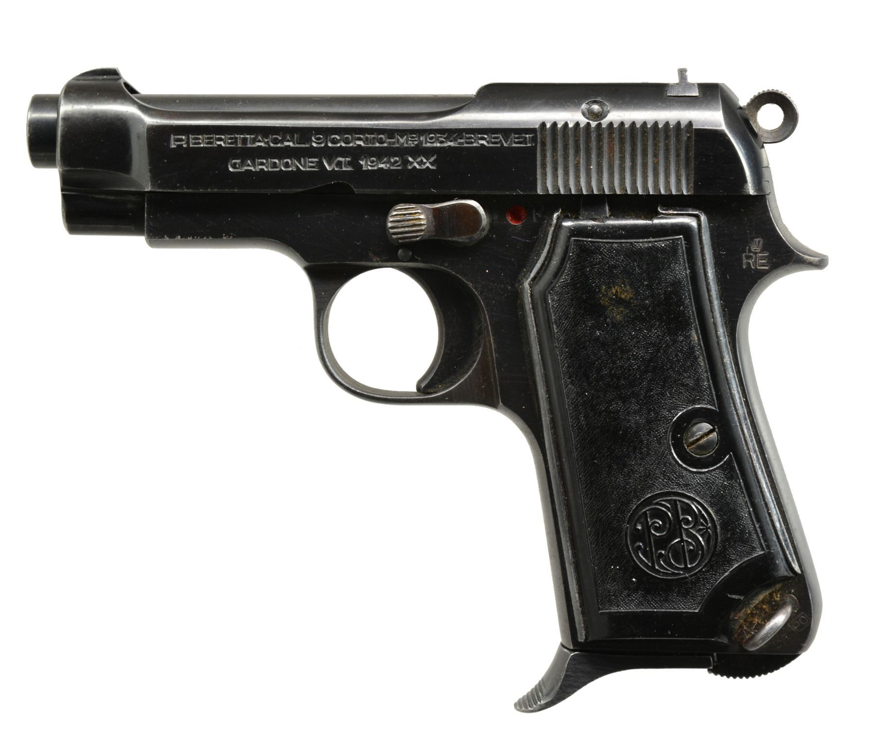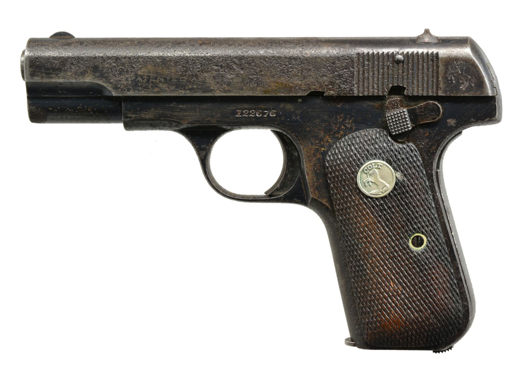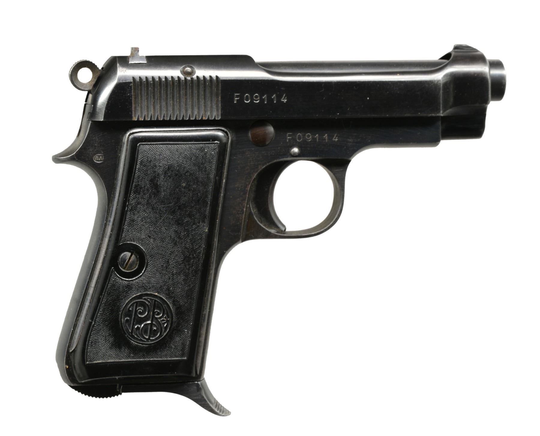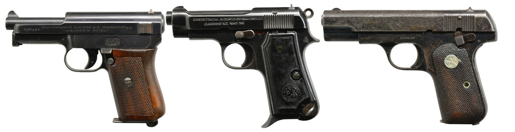1) MAUSER MODEL 1914. Cal. 7.65mm (32 ACP). S# 297431. Bbl. 3.4". Mfg. 1914-1934 w/ checkered walnut 1 piece grip. Crown U proofed & "GERMANY" export marked on rear of frame below S#. Matching numbered bbl., slide & sideplate. Blued finish w/ niter blue on trigger & extractor. MAGS: 1 fair 8 rd. w/ scattered light oxidation, in the white body & blued floorplate. CONDITION: peppery to light oxidation throughout. Good to very good grips w/ light wear & minimal marks. Near excellent bore. (20-258/NW). 2) BERETTA MODEL 1934. Cal. 9mm Corto (380 ACP). S# F09114. Bbl. 3 3/8". Mfg. 1942 as marked on slide plus "XX". Mfg. 1934-1945 for military use & 1946-1984 for post war commercial sales. High polish finish w/ "RE" army marking at top left rear of frame. Boxed "PO" by lanyard loop, boxed "M?"on right front of trigger guard, "X" on left side of butt near rear & "IVU" in oval at top right rear of frame. Matching numbered slide. "PB" logo hard rubber metal backed grips. MAGS: 1 very good 7 rd. w/ steel finger extension floorplate. CONDITION: good plus original overall appearance w/ pinprick oxidation throughout along w/ occasional spots of peppery oxidation. Very good grips w/ sm. chips at top of left. Good to very good bore w/ spots of cleaned light pitting. (20-259/NW). 3) COLT MODEL 1908. Cal. 380 ACP. S# 122676. Bbl. 3 3/4". Mfg. 1936 w/ blued finish & checkered walnut grips. Type IV indicating w/ mag. safety. MAGS: 1 fair factory 7 rd. w/ noticeable cleaned pitting on body & light cleaned oxidation on floorplate. CONDITION: poor to fair overall appearance w/ light oxidation throughout frame accompanied by heavier oxidation & pitting on slide. Good grips w/ hand wear. Good bore w/ occasional cleaned spot of pitting. (20-262/NW). ALL CURIO. $750-1,000.