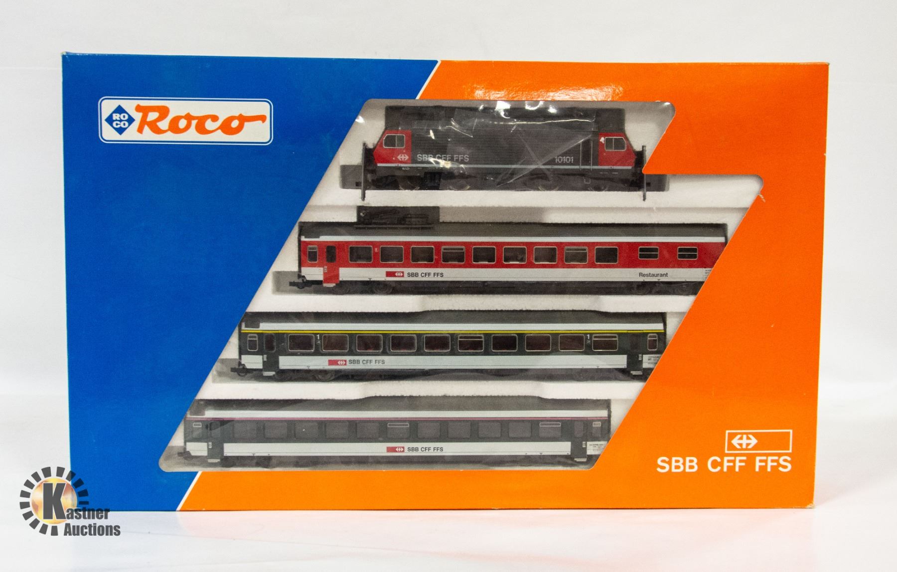 3 VINTAGE ROCO, HO TRAIN CARS + 1 LOCOMOTIVE