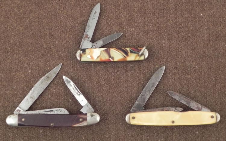 HERE ARE THREE VINTAGE SMALL POCKET KNIVES. ONE IS AN OLD TIMER AND TWO ARE KENT KNIVES. THE OLD TIMER IS BY SCHRADE WALDEN. *