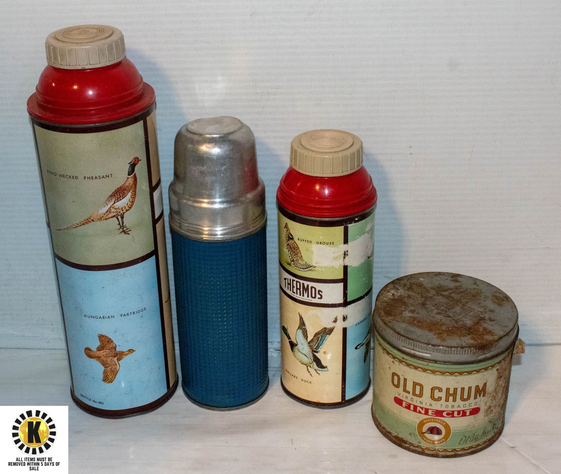3 VINTAGE THERMOSES AND 1 TOBACCO TIN