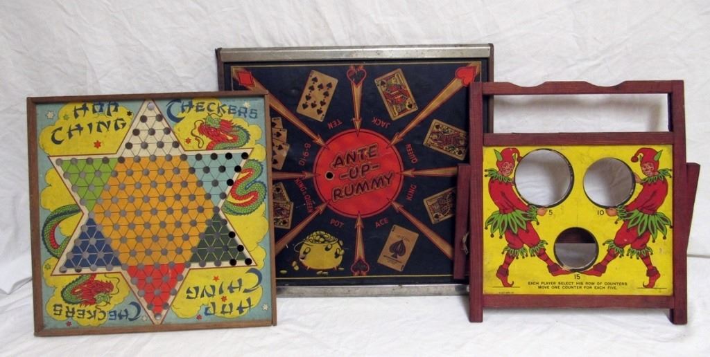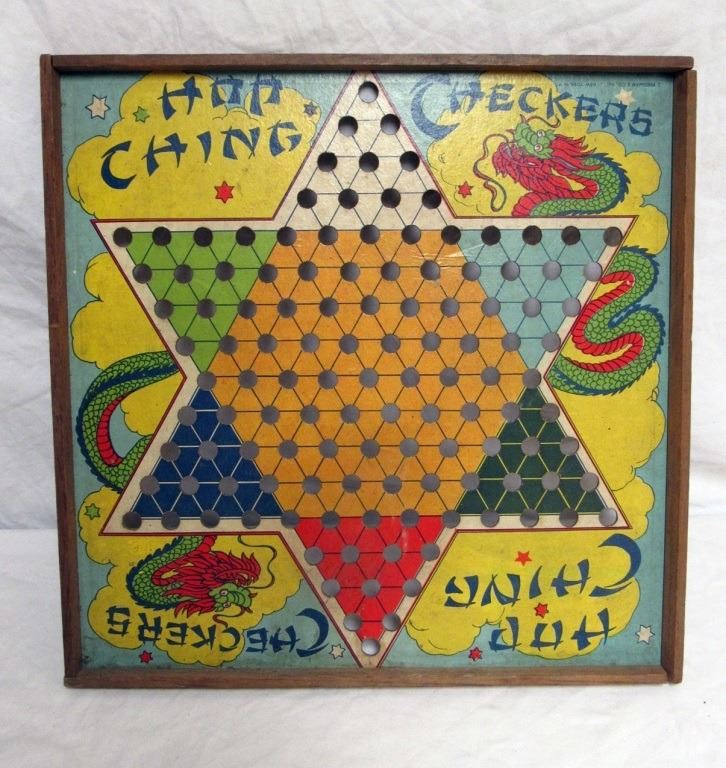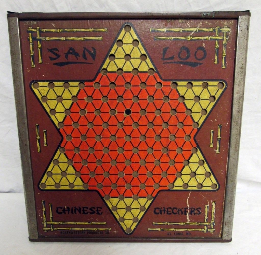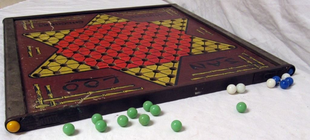 COUNTERS. J. PRESSMAN CHINESE CHECKERS. VINTAGE 1930’s ANTE UP RUMMY/SAN LOO CHINESE CHECKERS GAME BOARD ANTIQUE- INCLUDES ORIGINAL MARBLES IN BOTH SIDES OF THE BOARD- EXACT SHIPPING