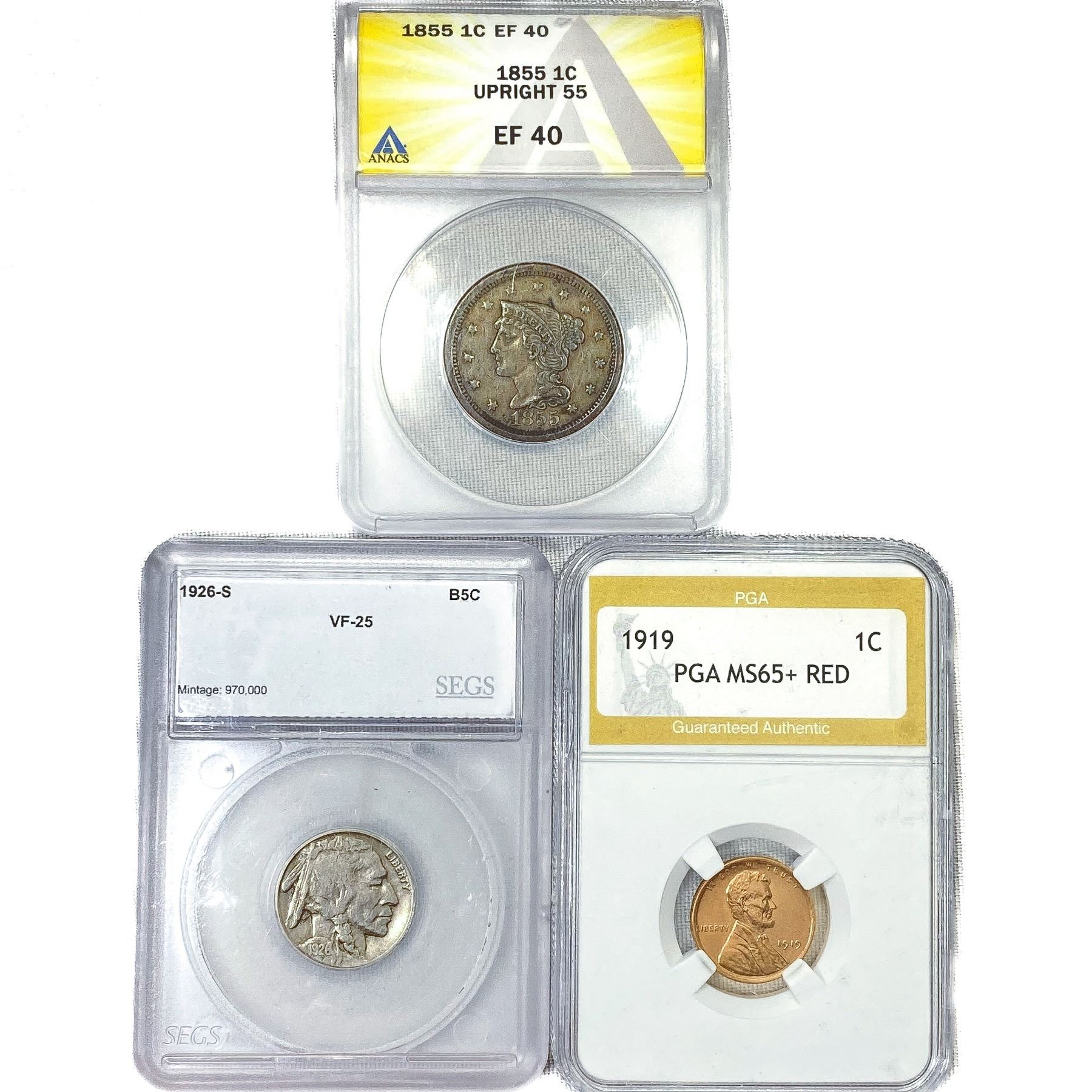 (3) Varied US Coinage (1855, 1919, 1926-S)
