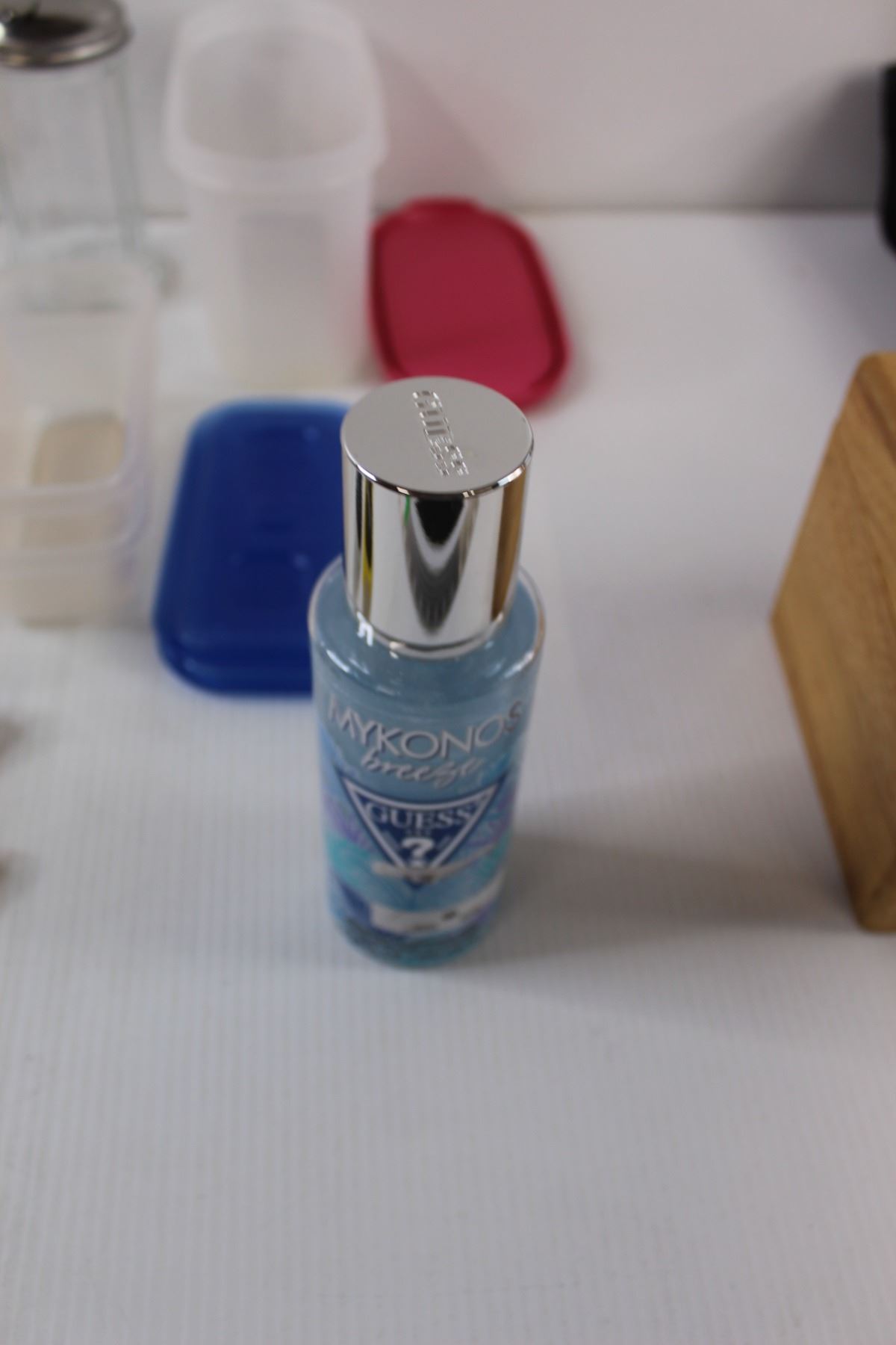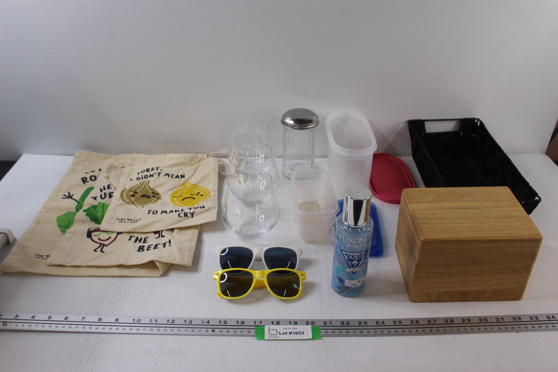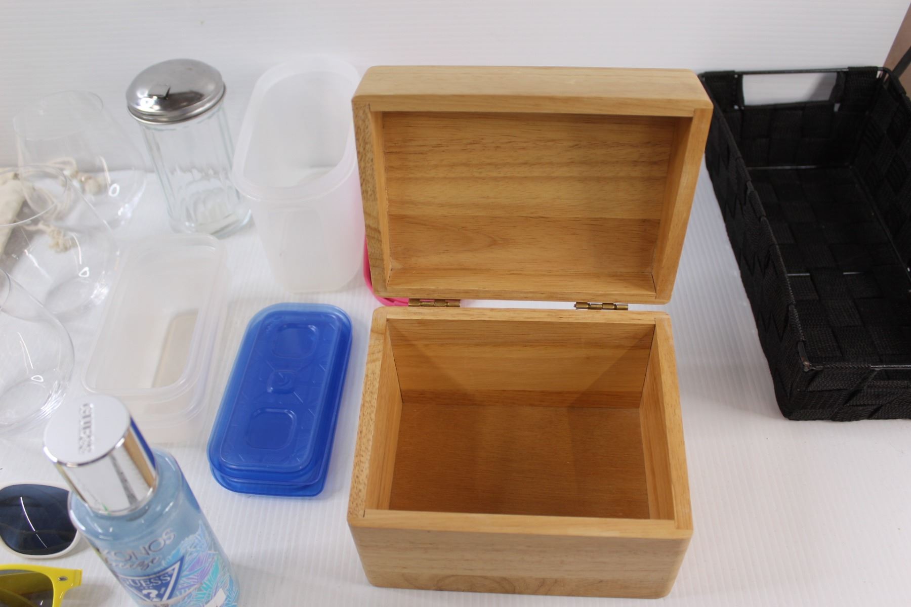 (3) Vegetable Sacks, (3) Wine Glasses, (2) Sunglasses, (3) Small Containers w/ Lids, Glass Sugar Container, Guess Fragrance Mist, Small Wooden Chest 7"x5"x5", & Black Basket 6.5"x12"x2"