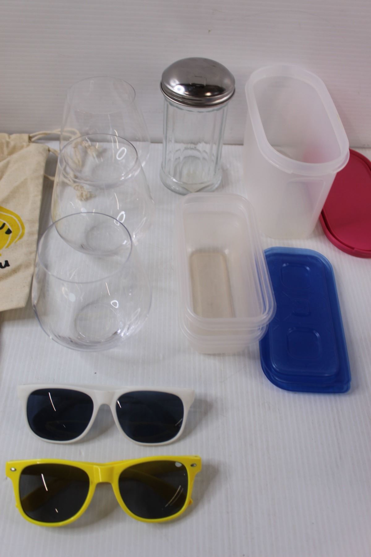 (3) Vegetable Sacks, (3) Wine Glasses, (2) Sunglasses, (3) Small Containers w/ Lids, Glass Sugar Con