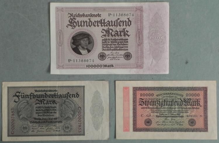 3 Very Hi-Grade German Paper Money 1923 * * Condition: Very hi-grade * 20,000 Marks * 100,000 Marks * 500,000 Marks *