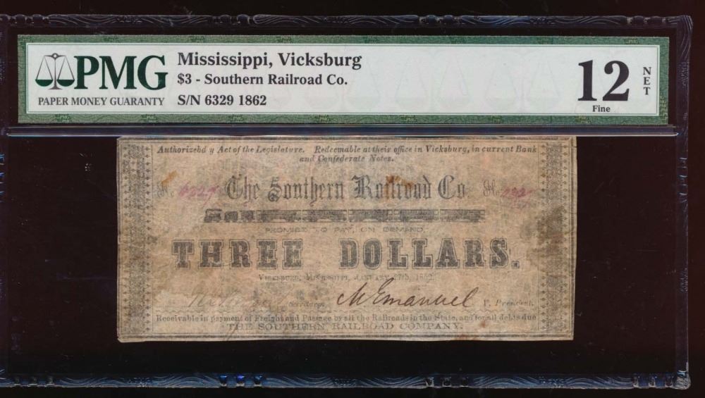 One $3 Vicksburg Obsolete Note PMG 12NET.