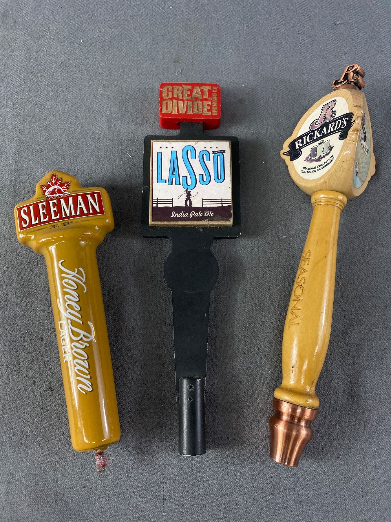 3 Vintage Bar Tap Pulls - Rickards Cardigan, Sleeman Honey Brown and Great Divide Brewing