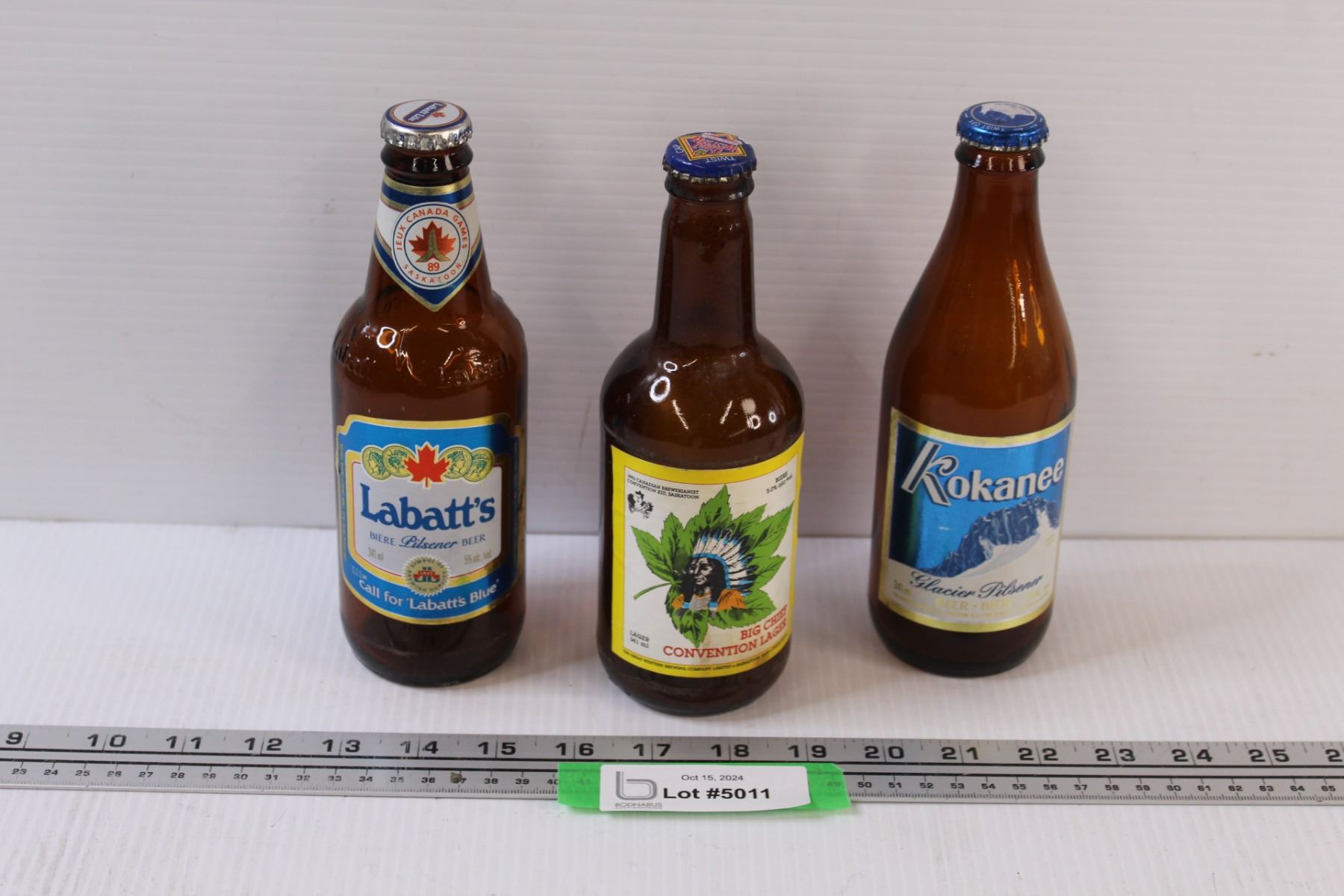 (3) Vintage Beer Bottles: Big Chief, Labatt's, Kokanee