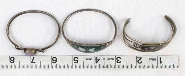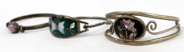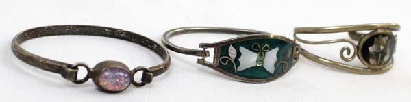 3 Vintage Bracelets, includes 2 inlay abalone shell bracelets and 1 Taxco Sterling Opal Bracelet which is hallmarked and stamped .925 and has a total gram wt. of 17.36, largest measures 7''