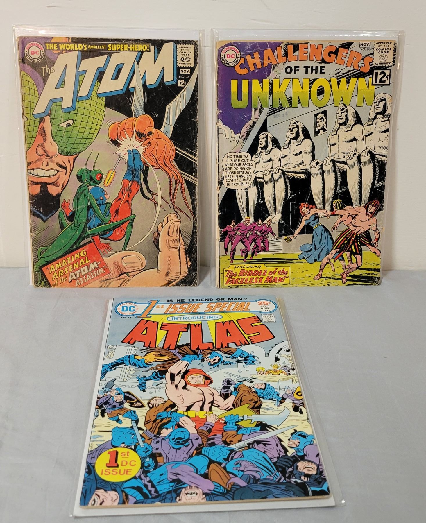 The Atom #33 1967(low), Challengers of the Unknown #28 1962(low), Atlas 1st Issue Special(mid+-high-).