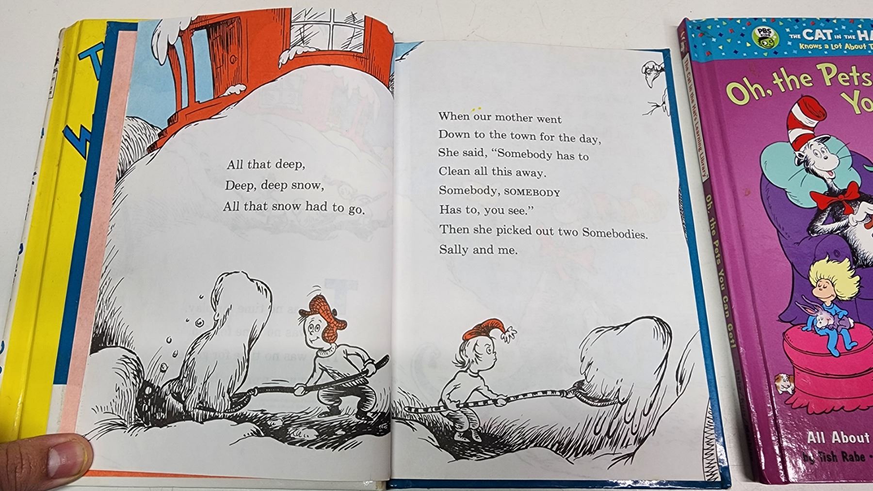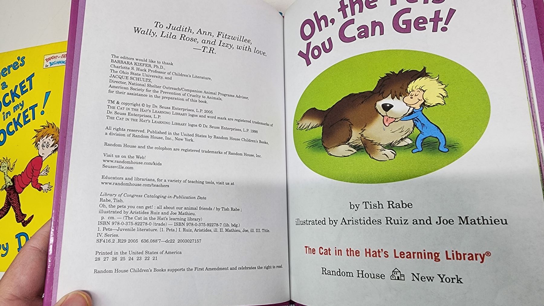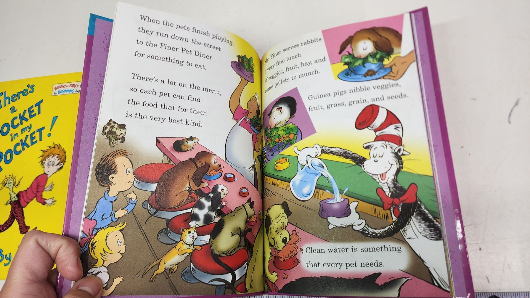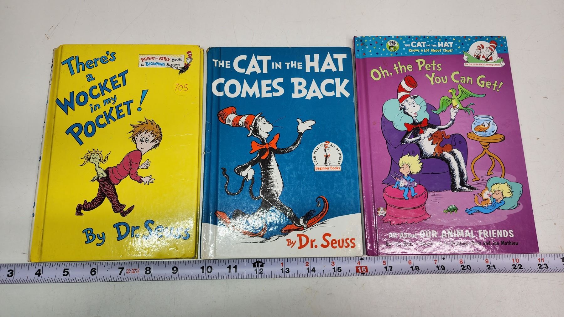 3 Vintage Dr. Seuss books - "There's a wocket in my pocket", "The cat in the hat comes back", & "Oh, the pets you can get!"