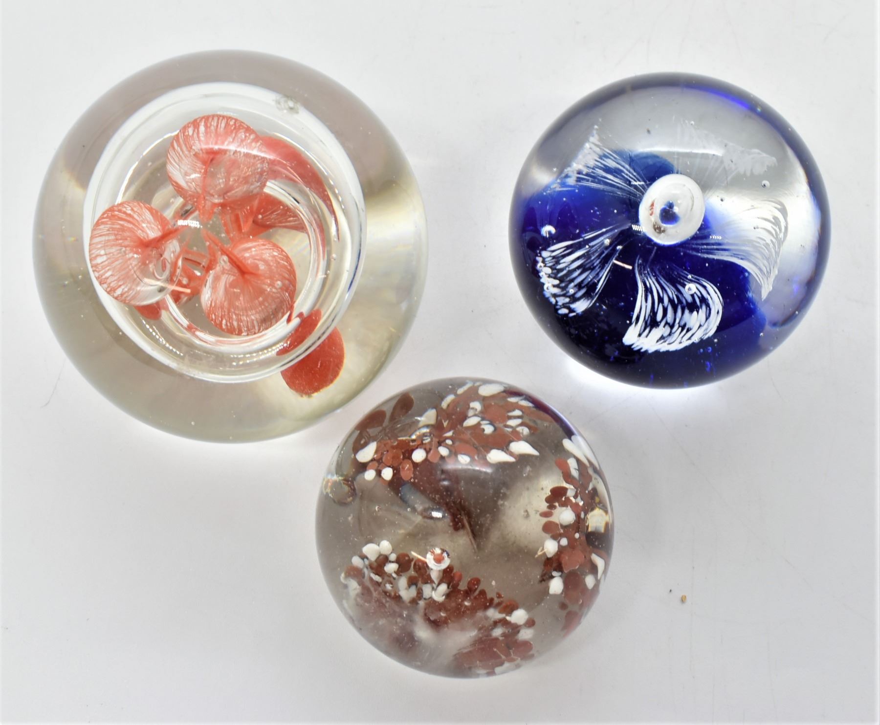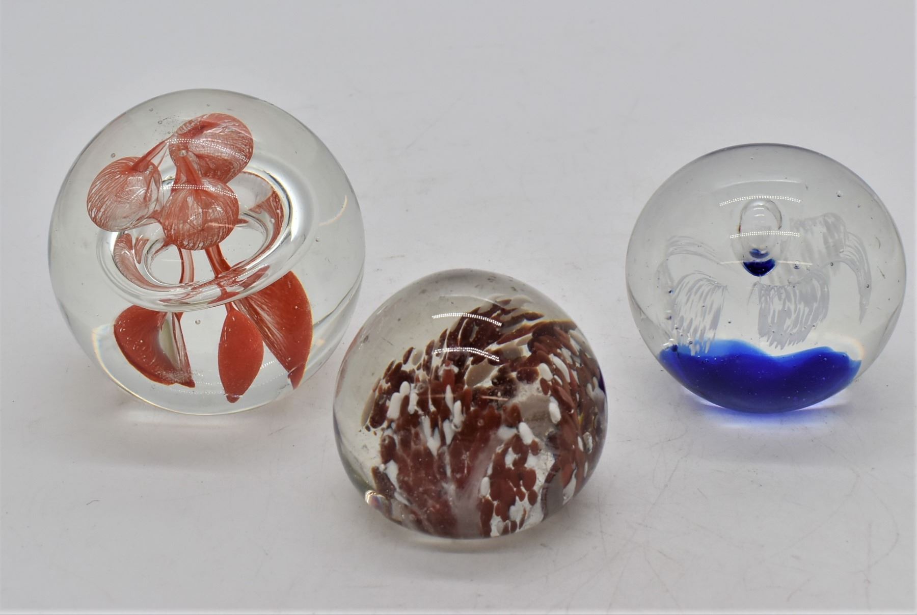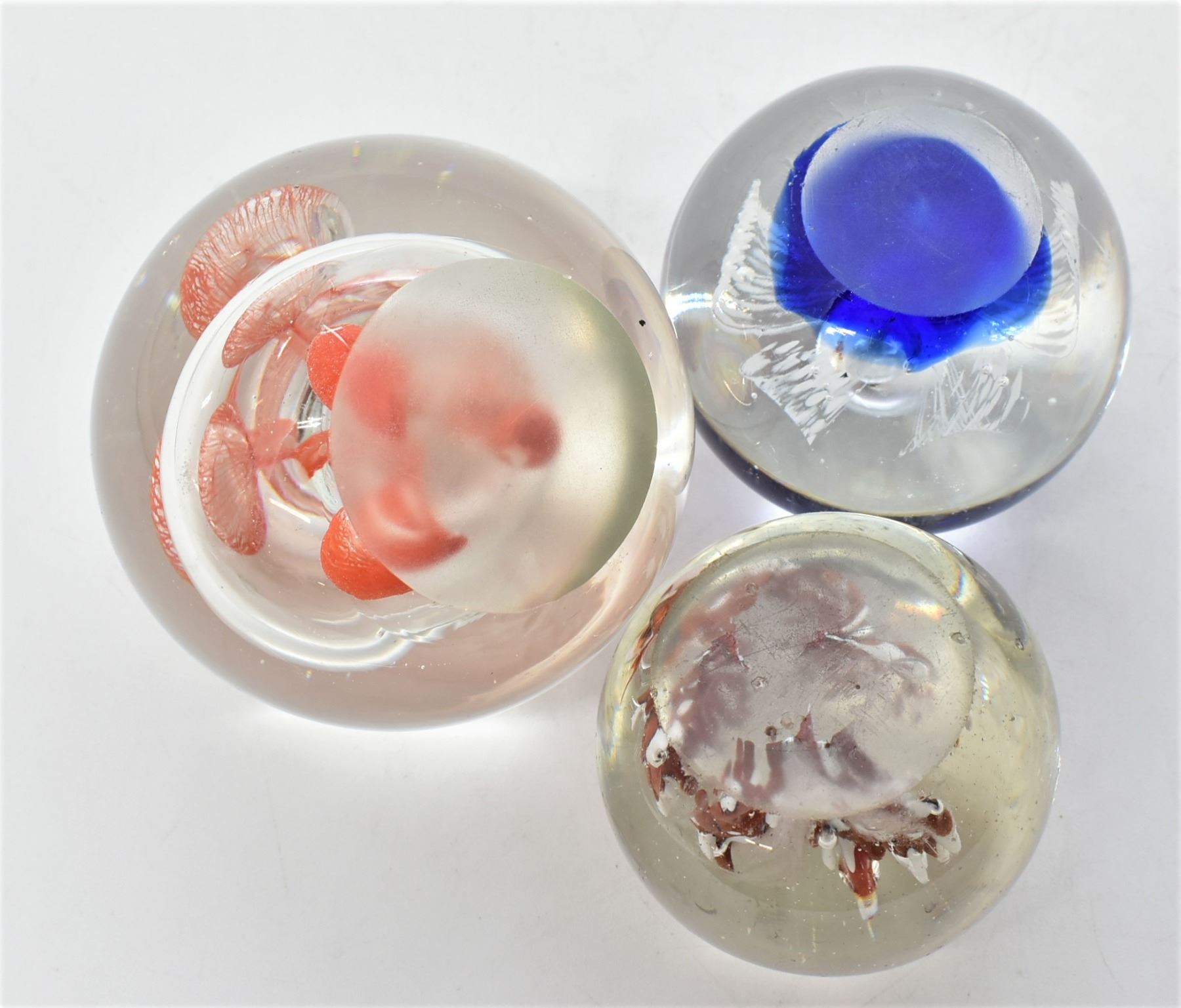 3 Vintage Hand Blown Glass Paperweights, polished pontils, largest measures 3''D, gorgeous colors