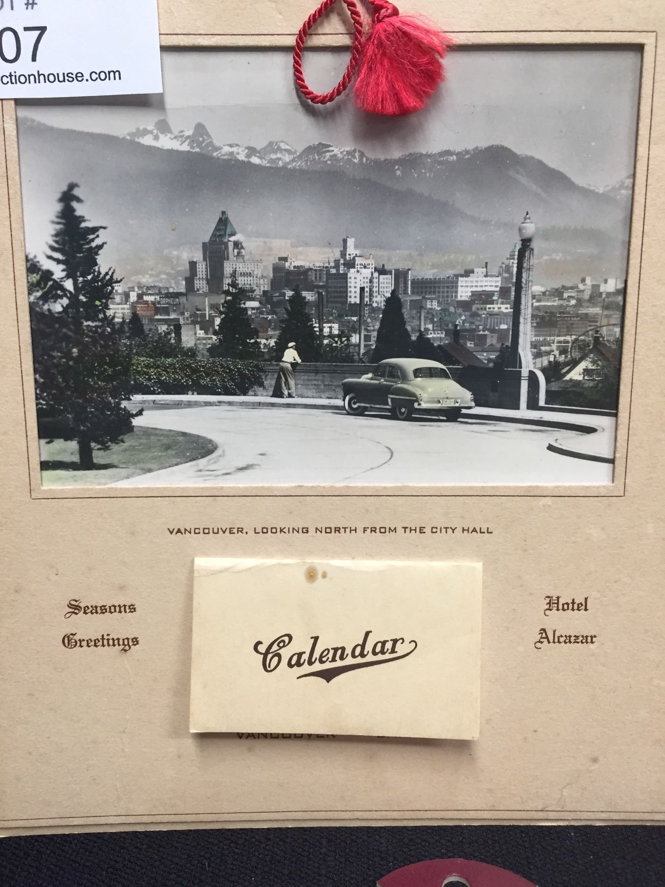 3 Vintage Items. Kamloops Calendar from 1958, Hotel Alcazar Vancouver Calendar from 1953 and a Mirror Advertisment