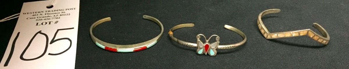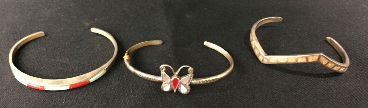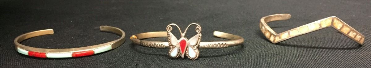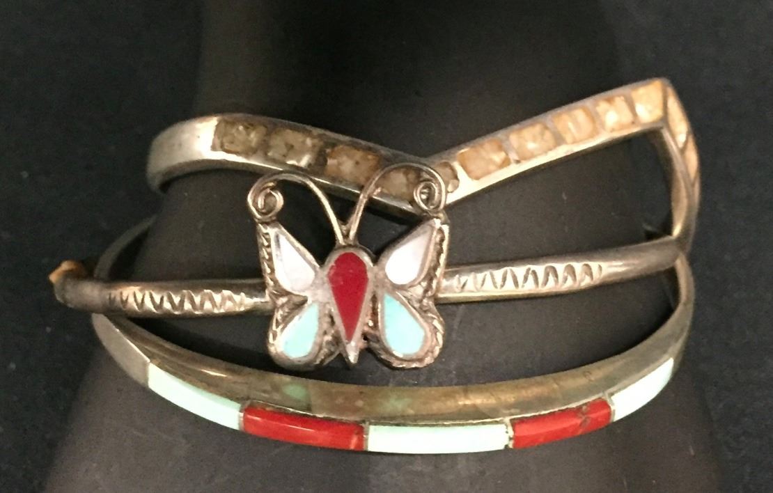 You get all three of these vintage, sterling inlay bracelets for one money. Collectively they weigh 30 g. All fit a small to medium size wrist. Please look closely at pics - they are an important part of our description. Shipping: There will be a $5 handling / packaging fee for shipping this lot. The actual cost of postage will be added on top of that.