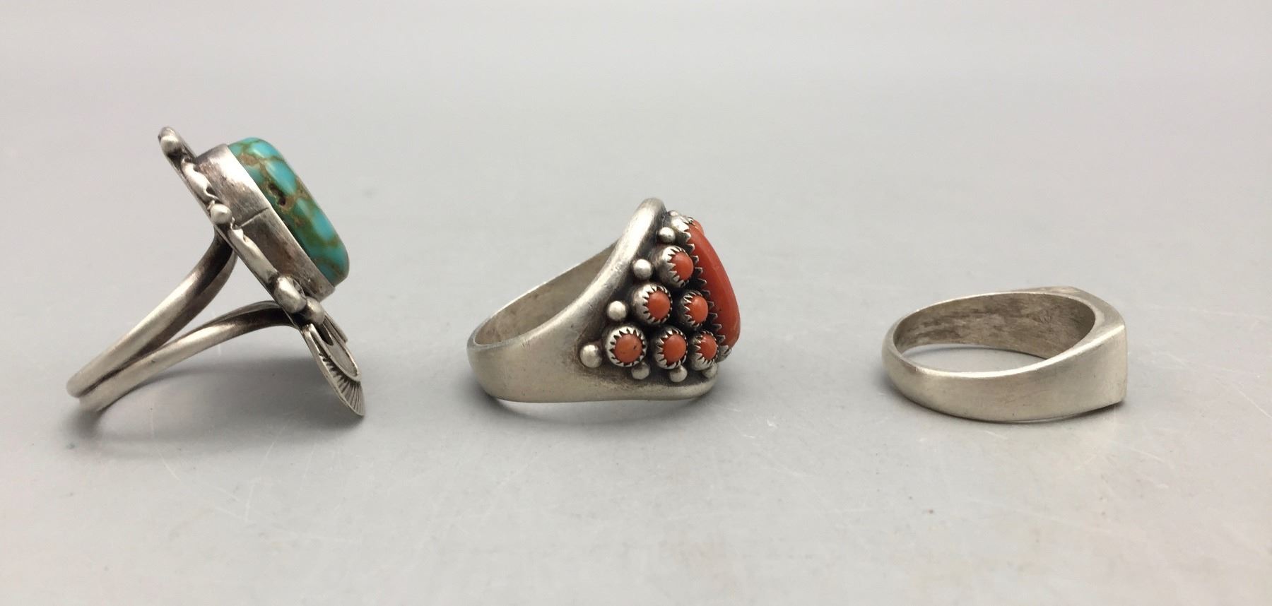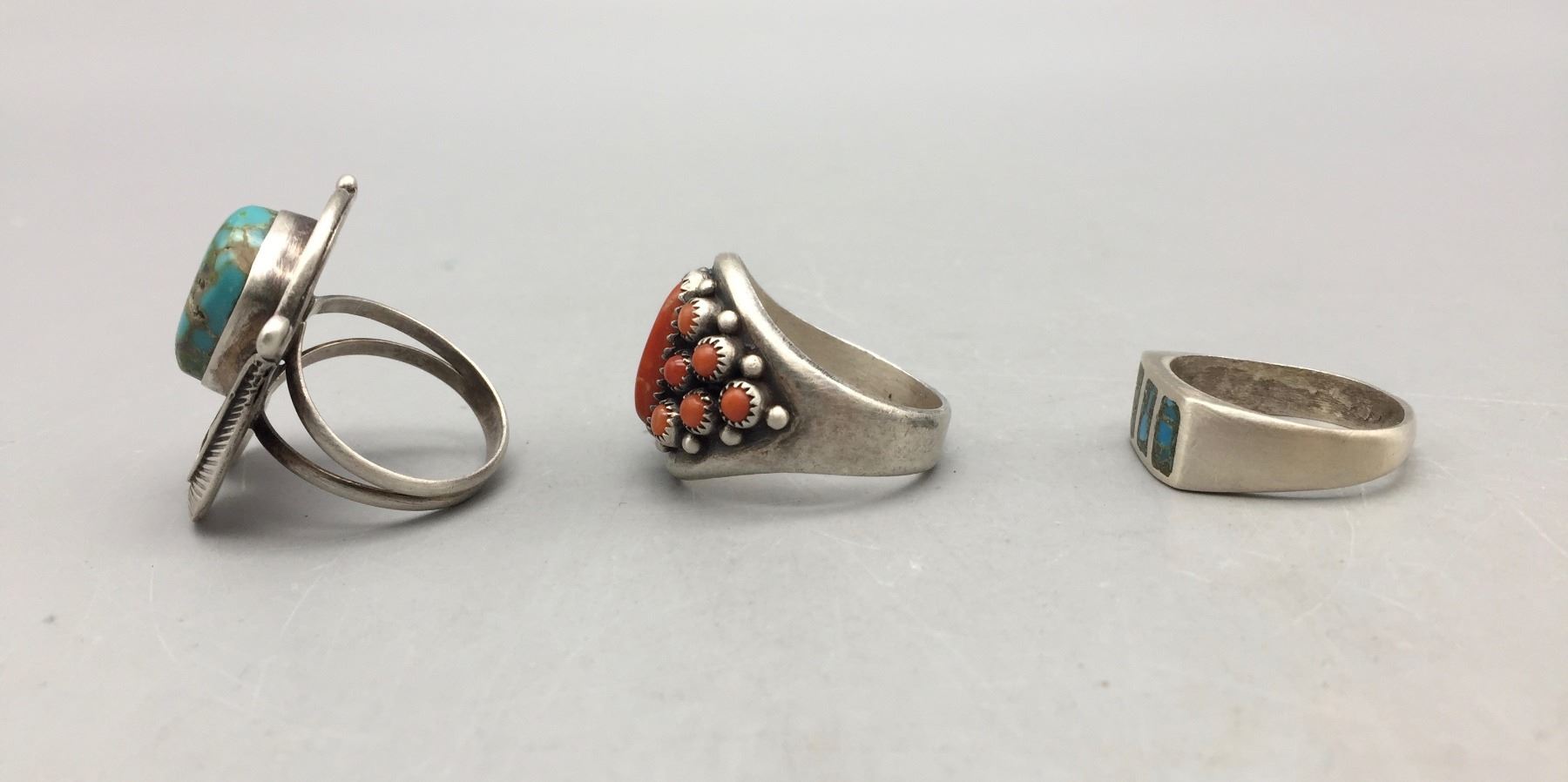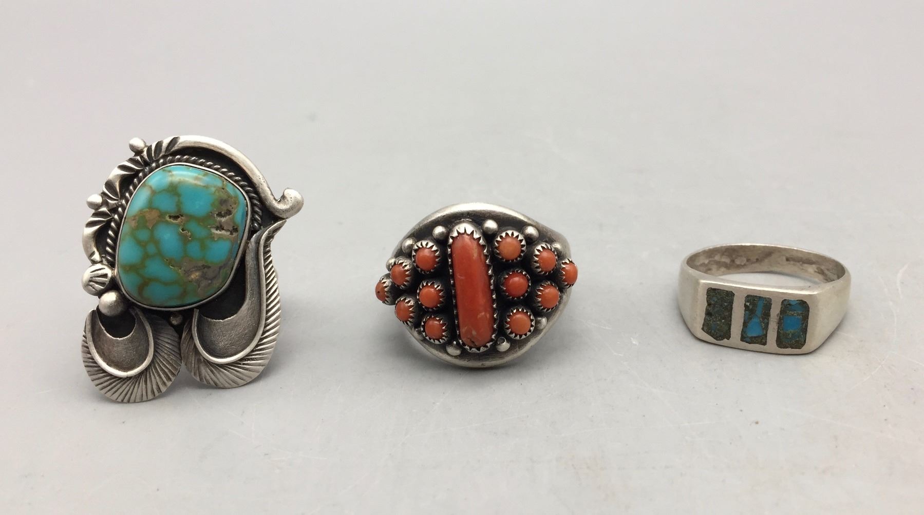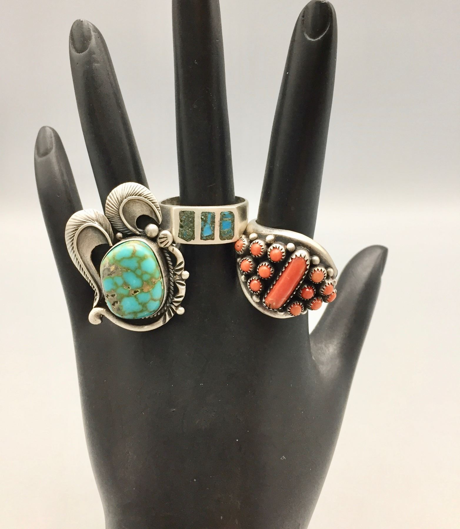 Description: Included for sale in this lot is three rings. One ring has 13 coral stones, another ring features a high-grade turquoise stone and the last ring has turquoise, chip inlay. All are sterling silver. Maker: No hallmarks were observed. Approx. Age: Vintage. Size: 12, 10, and 8-1/2. Combined weight of 32.8 grams. Condition: Good for its age, normal wear expected. Please look closely at the pictures - they are an important part of our description. Shipping: There will be a $5 handling / packaging fee for shipping this lot. The actual cost of postage will be added on top of that.