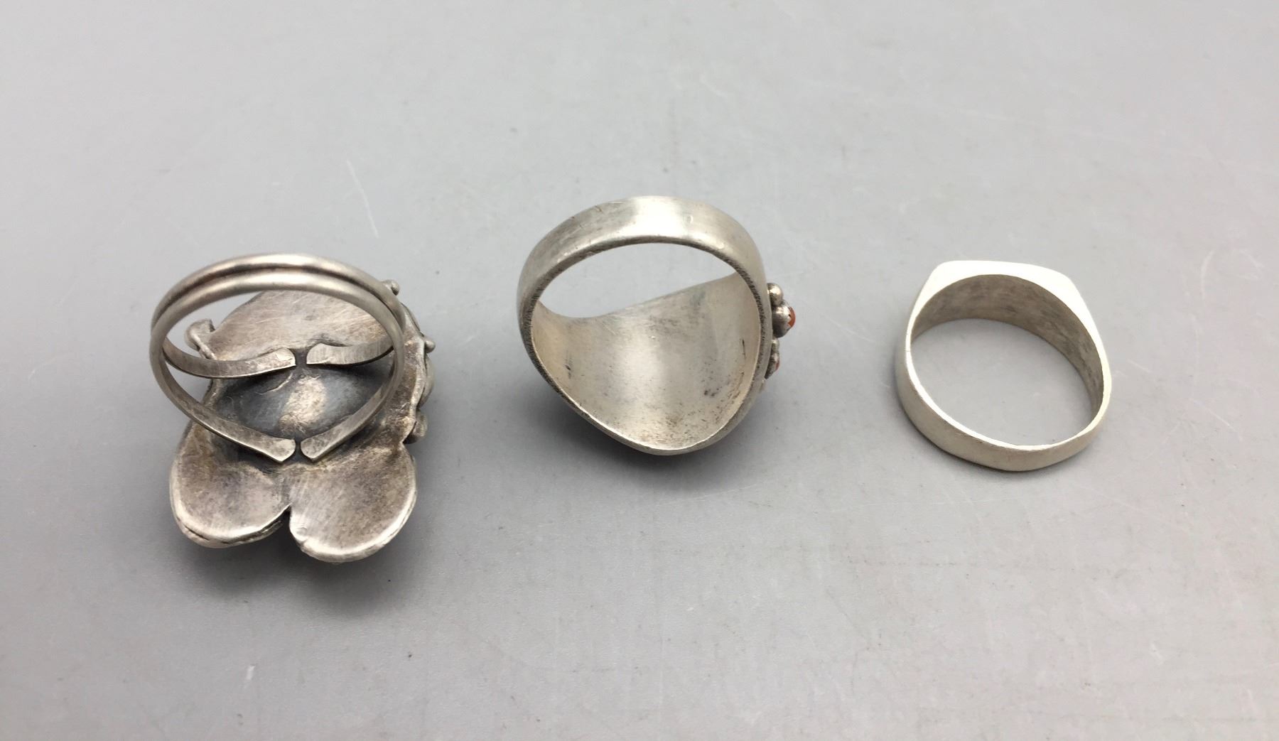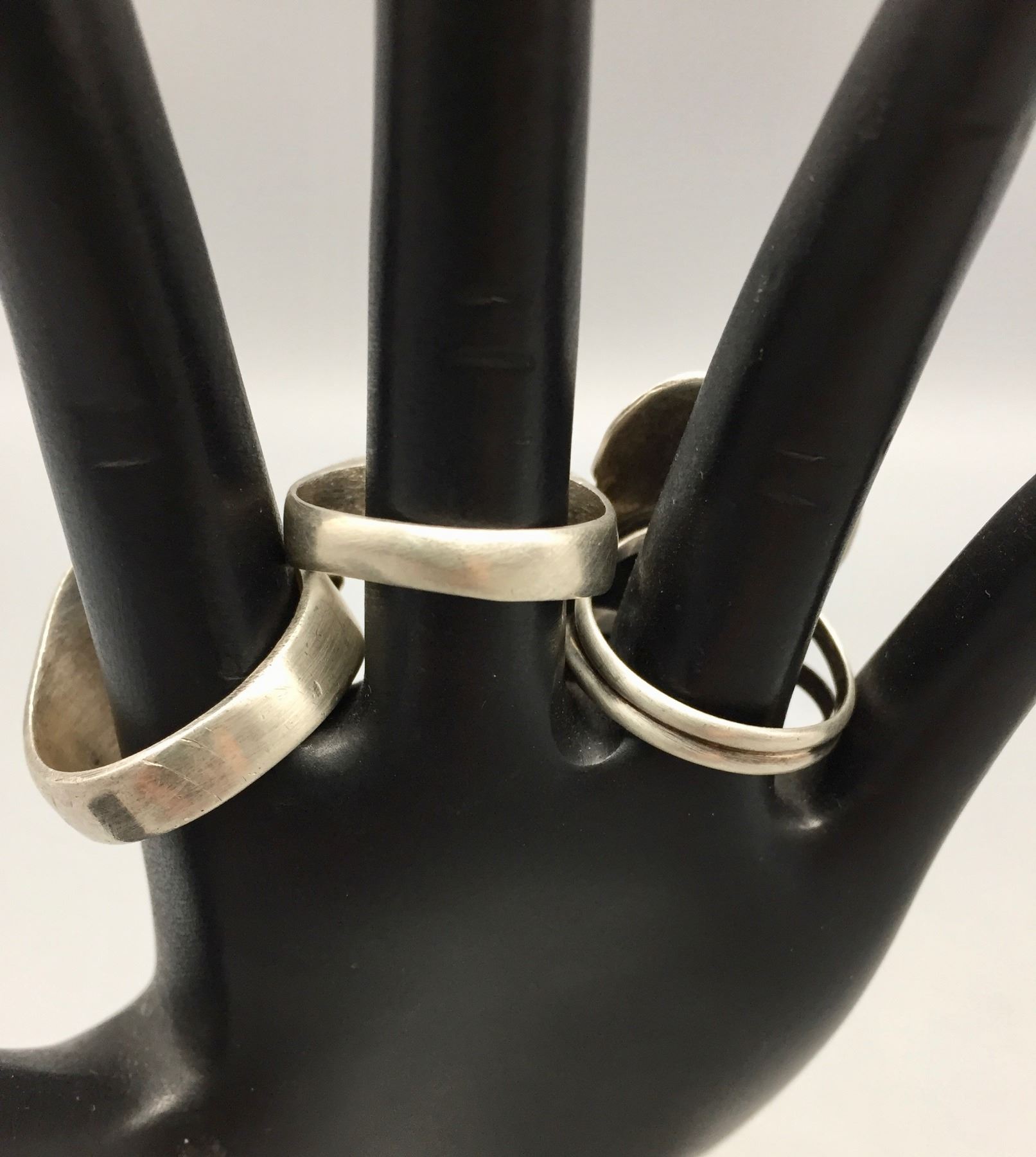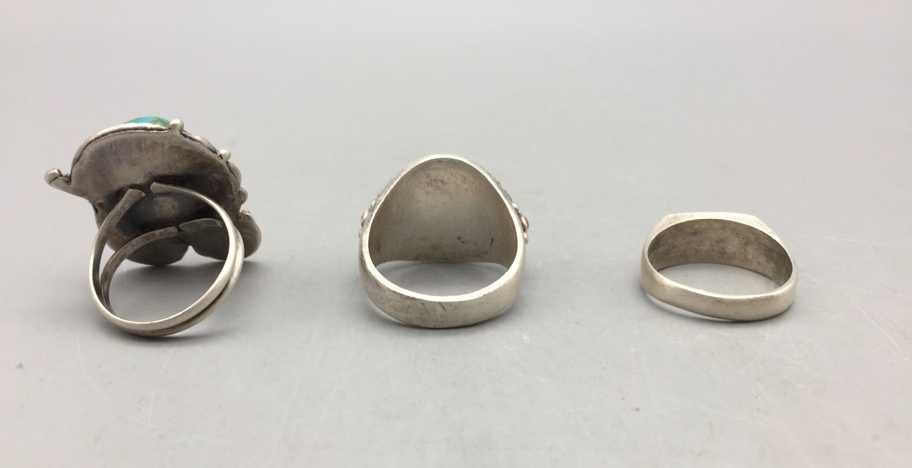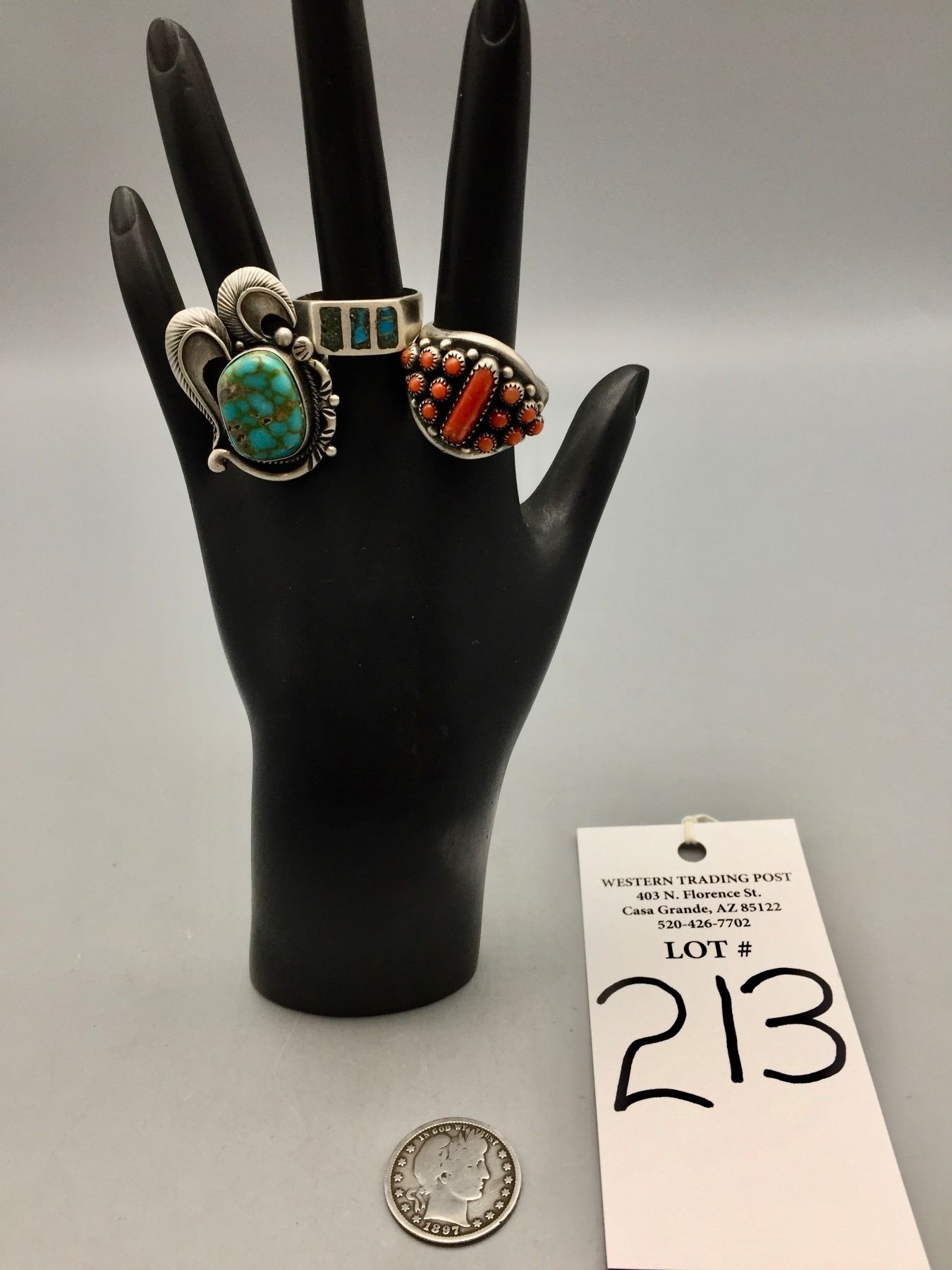 Description: Included for sale in this lot is three rings. One ring has 13 coral stones, another ring features a high-grade turquoise stone and the last ring has turquoise, chip inlay. All are sterling silver. Maker: No hallmarks were observed. Approx. Age: Vintage. Size: 12, 10, and 8-1/2. Combined weight of 32.8 grams. Condition: Good for its age, normal wear expected. Please look closely at the pictures - they are an important part of our description. Shipping: There will be a $5 handling / packaging fee for shipping this lot. The actual cost of postage will be added on top of that.