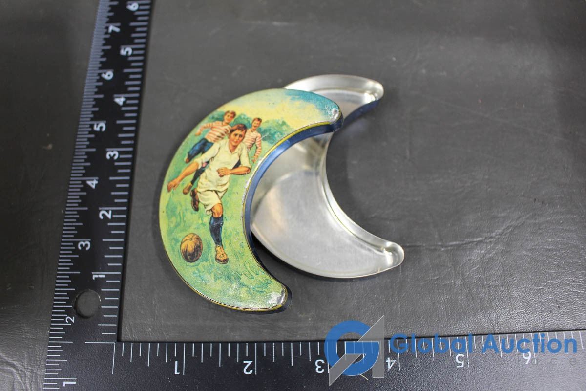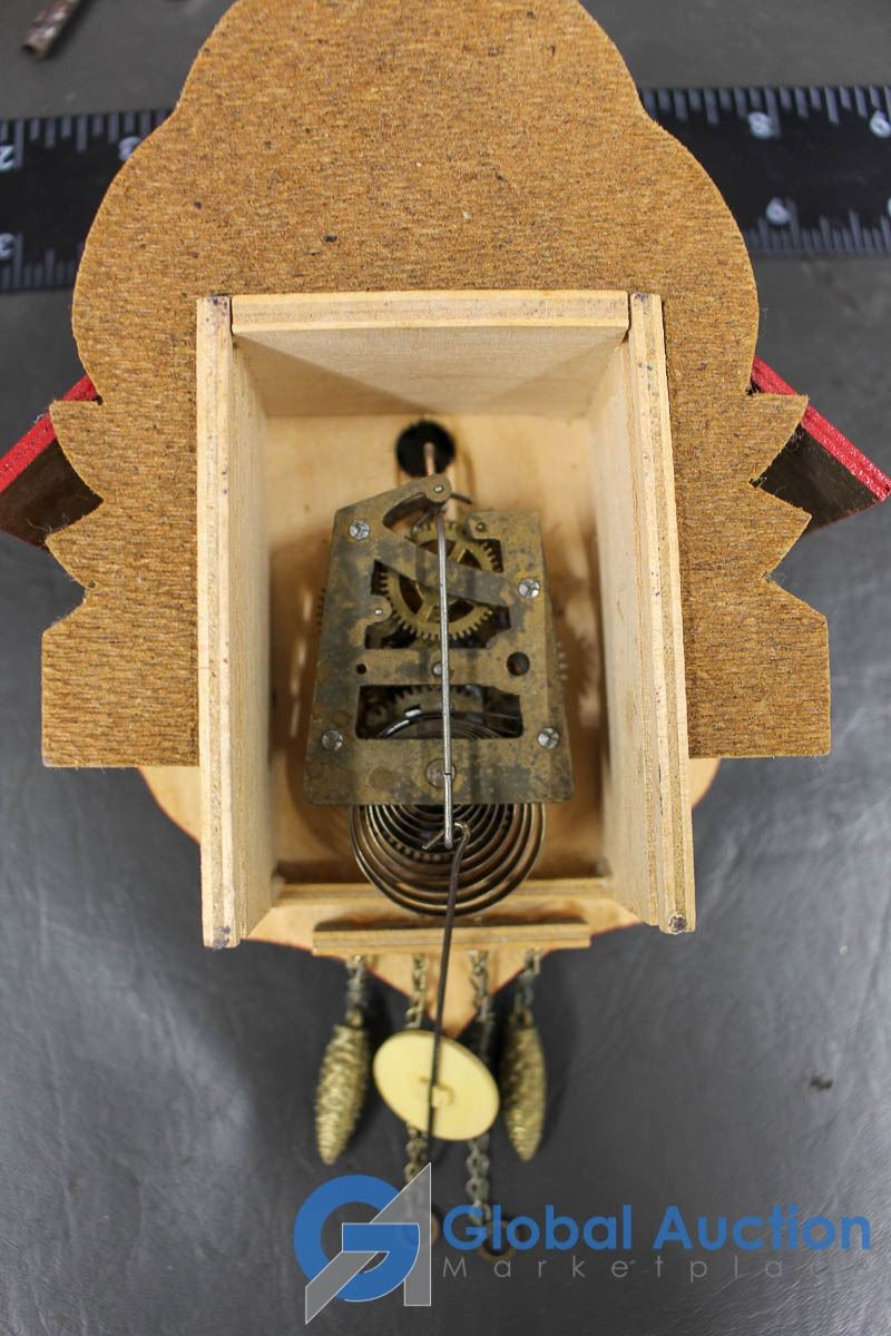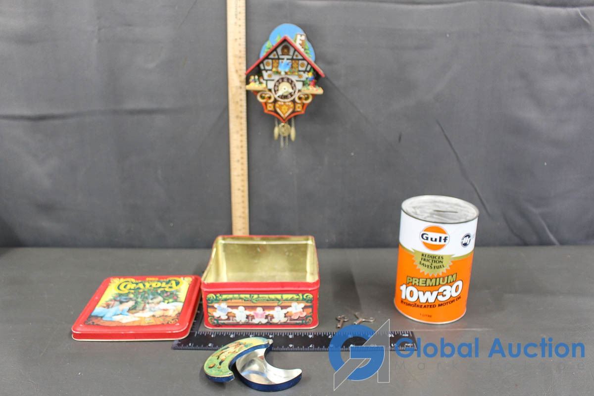 (3) Vintage Tins (Gulf Coin Bank, Crayola, Peppermint Drops) & Miniature Wooden Cuckoo Style Clock
