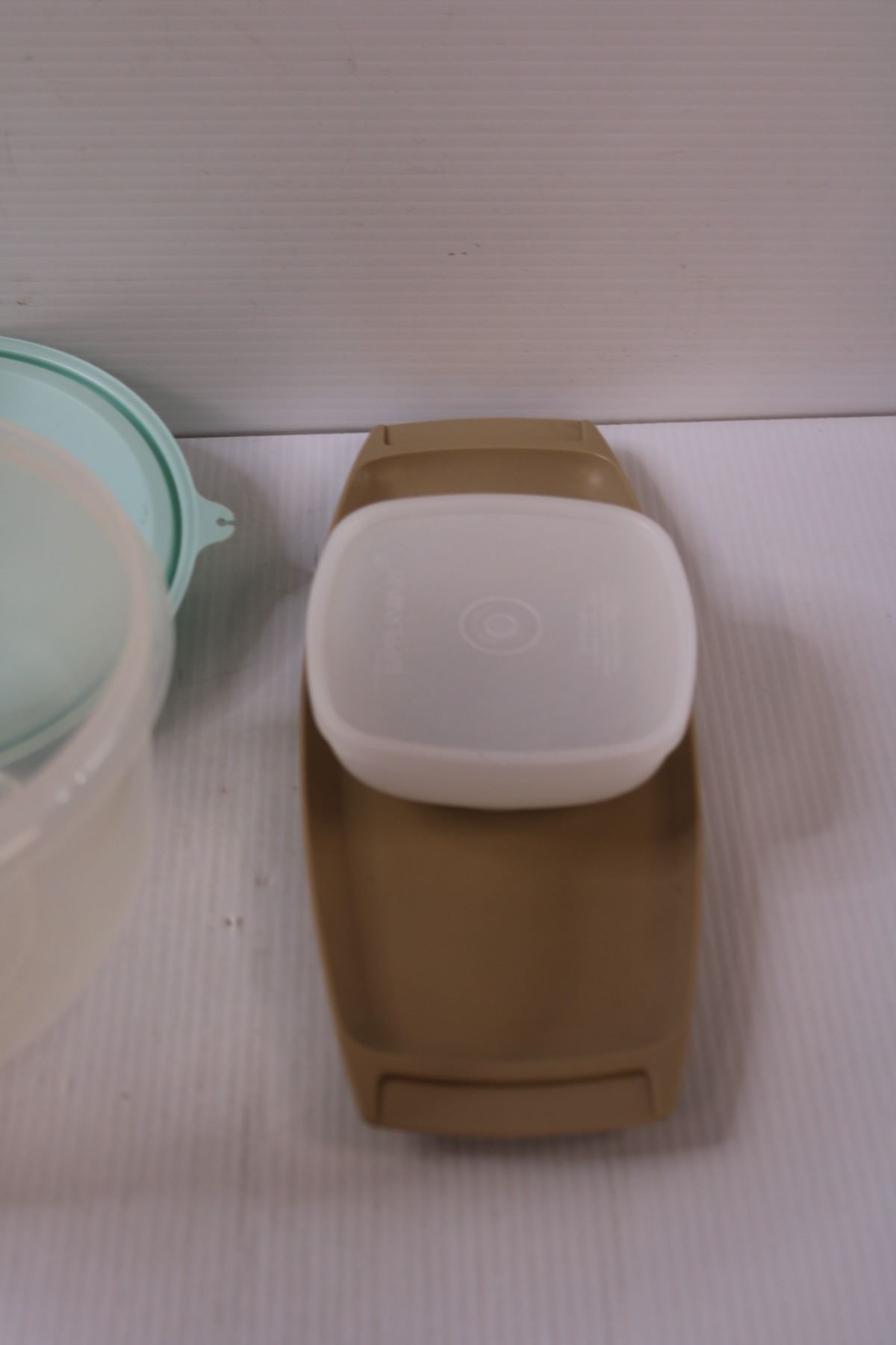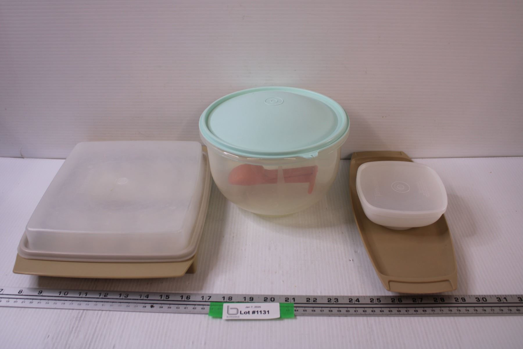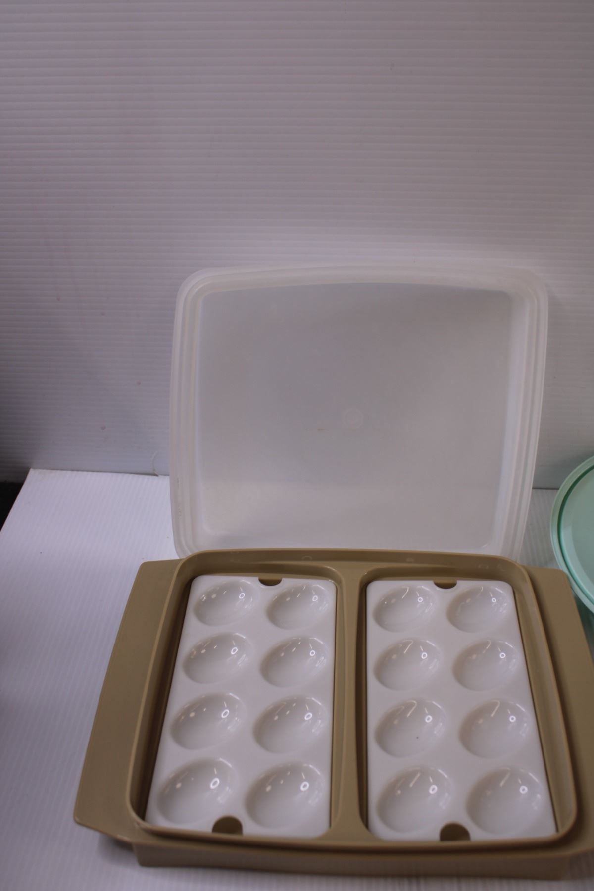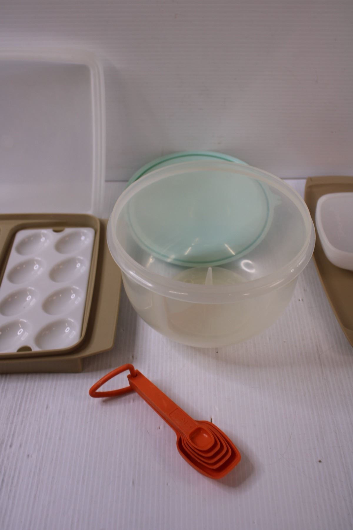 (3) Vintage Tupperware Containers: Deviled Eggs Tray w/Lid, Veggie & Dip Tray, Mixing Bowl & Measuring Spoons Set