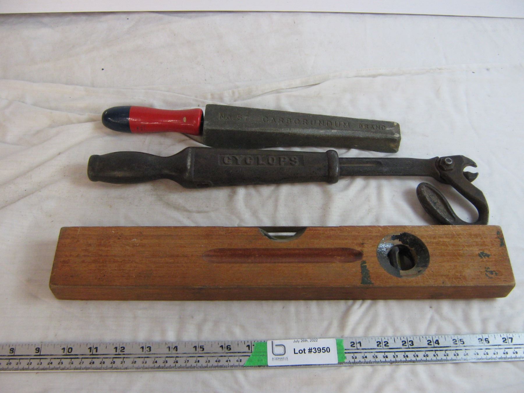 (3) Vintage tools, Level,Cyclops tool,knife sharpener