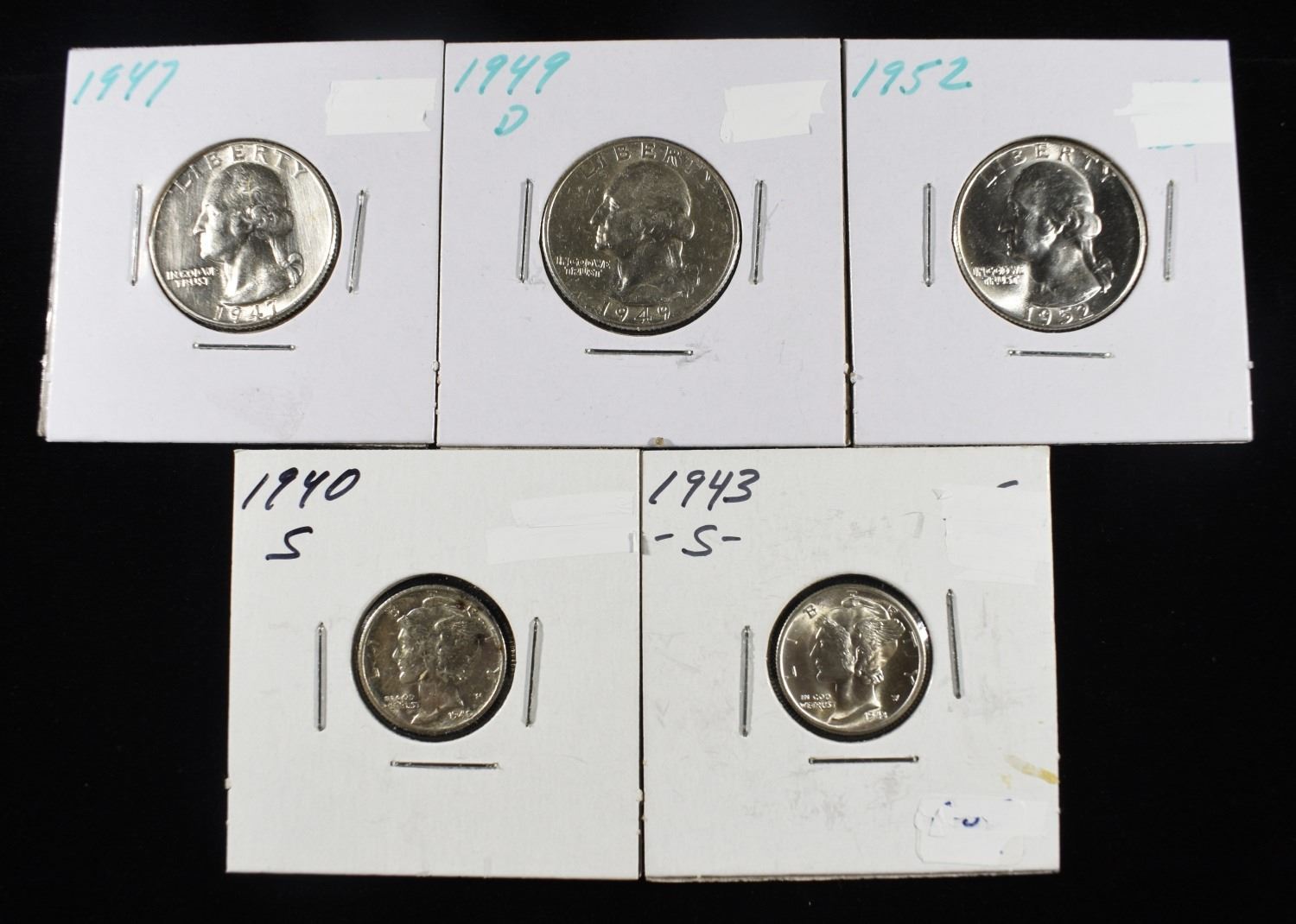 1947 BU,1949-D BU, 1952 CH BU WASHINGTON QUARTERS & 1943-S SUPERB GEM BU, 1940-S BU MERCURY DIMES ESTIMATE $80 - $120.